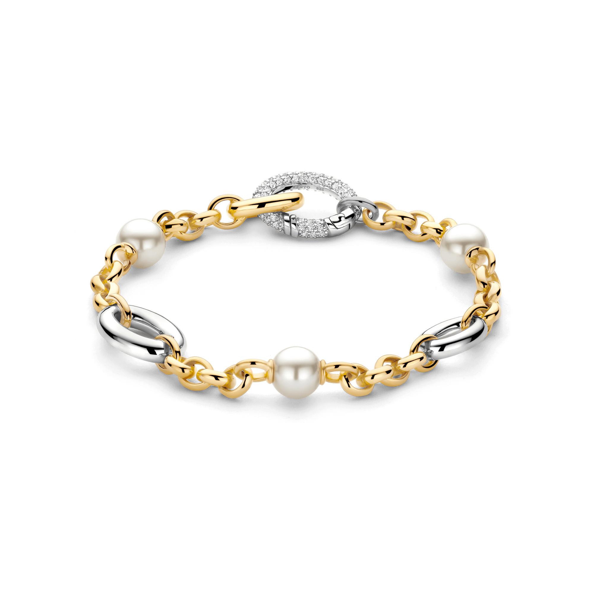 Conférez à votre style une touche luxueuse avec ce bracelet Ti Sento en argent plaqué or et perles. Ce design unique combine des maillons dorés, des perles lumineuses et des zirconium étincelants, créant un mélange harmonieux de raffinement et de charme. Grâce à ses propriétés sans nickel et hypoallergéniques, il offre un confort de port durable et de la qualité.