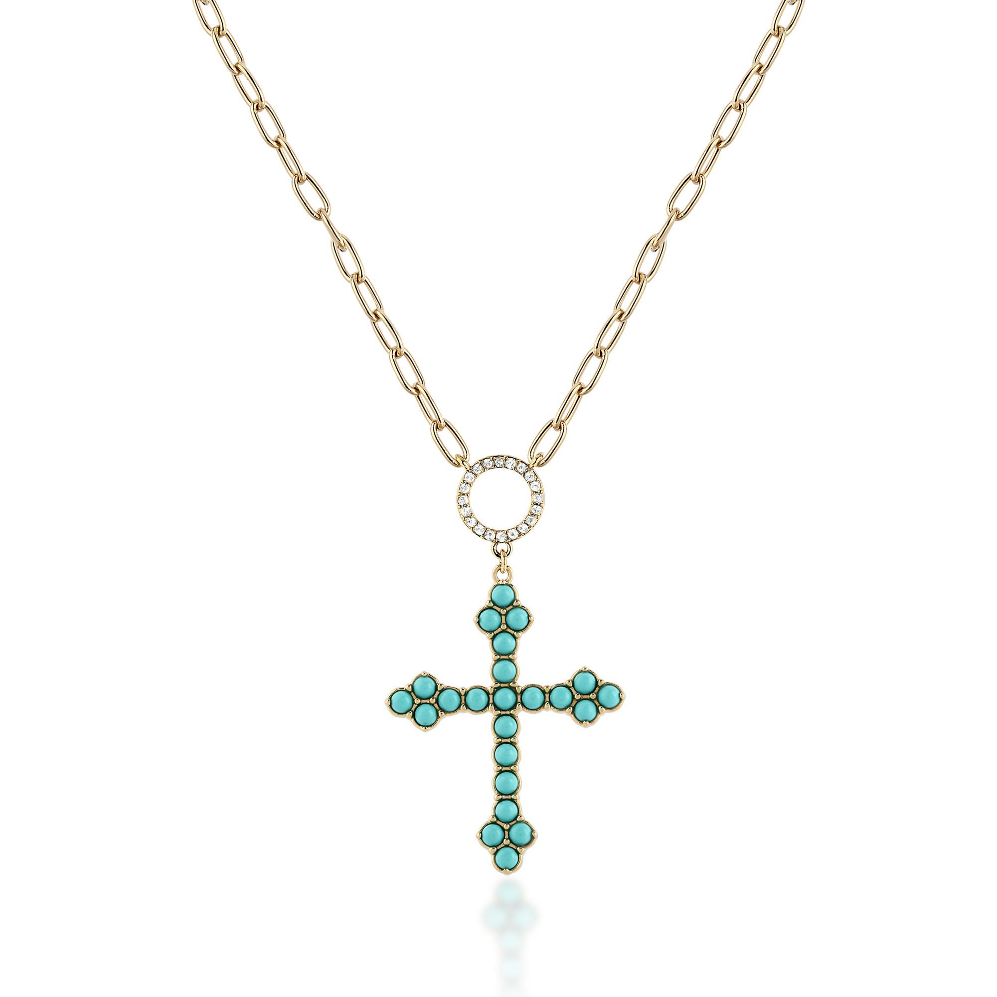 La chaîne Chiara Ferragni est un élément vedette tendance pour femmes fabriqué avec un revêtement en rhodium de haute qualité dans un ton doré élégant. Le pendentif en forme de croix remarquable avec une pierre turquoise bleu clair fait de la chaîne de 14 g un accessoire expressif – y compris le certificat d’authenticité et l’emballage Chiara Ferragni original.