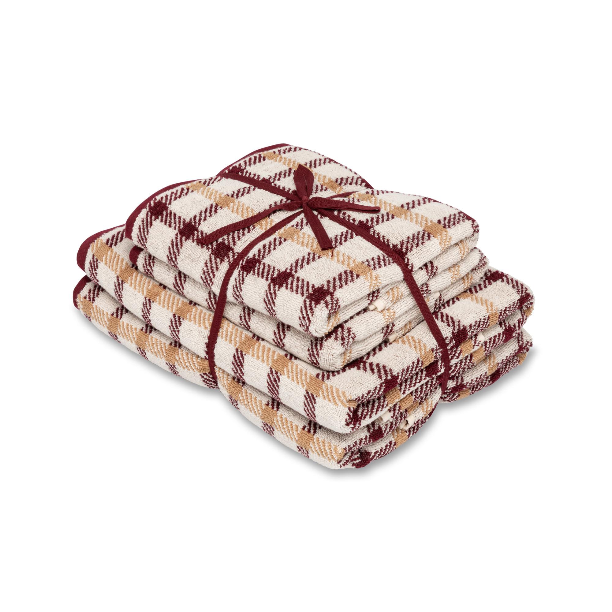 Cet ensemble de linge en tissu éponge de Manor se compose de deux serviettes de toilette et de deux serviettes de douche. Les serviettes à carreaux sont douces et absorbantes, dotées de bordures et de boucles de suspension.