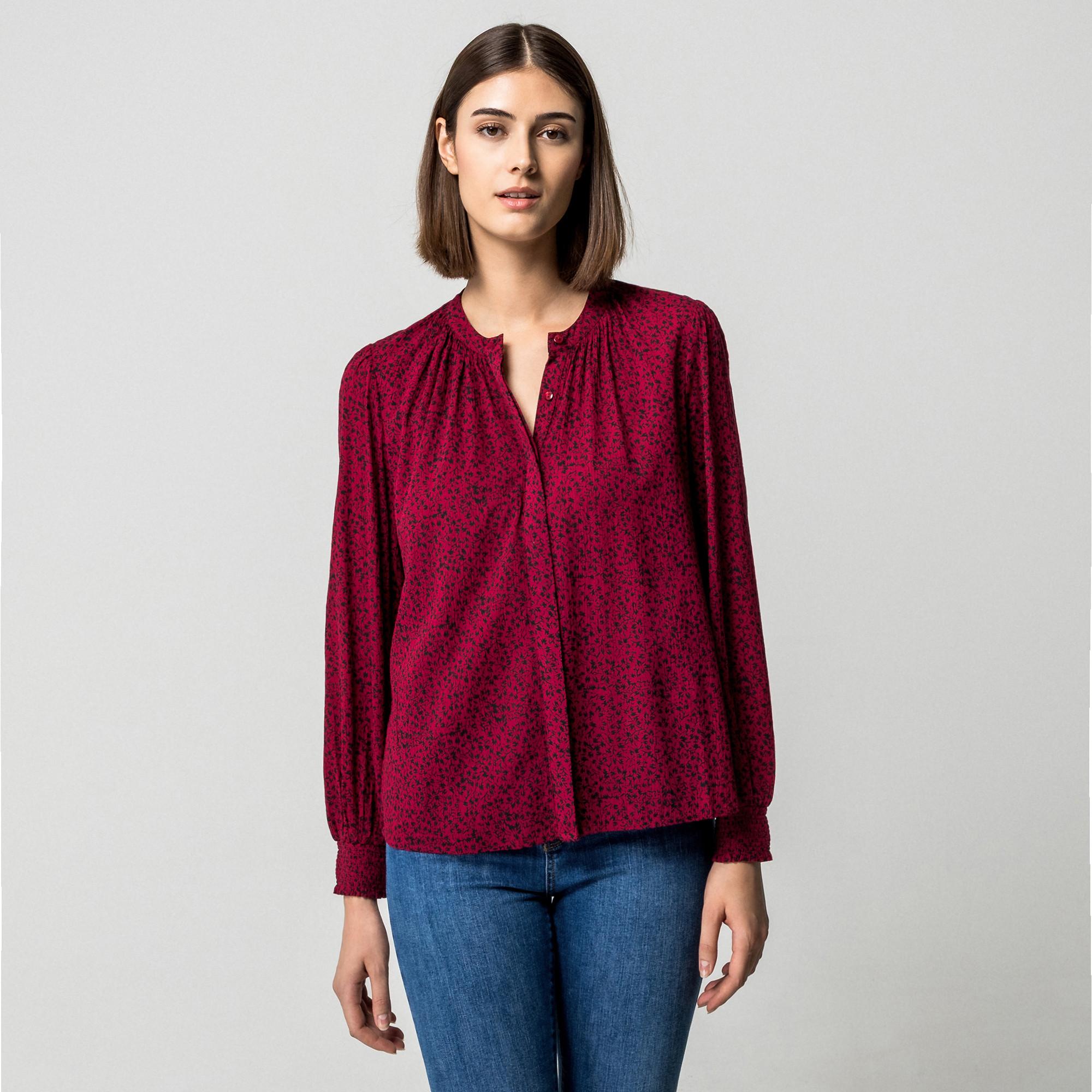 Ce chemisier est fabriqué à 100% en viscose. Avec une coupe décontractée et des détails classiques tels que des fronces et des extrémités des manches smockées, c’est un haut féminin qui se combine facilement.