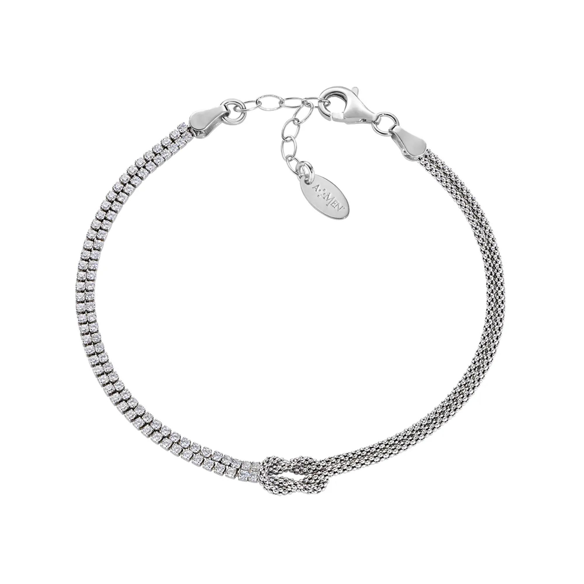 Le bracelet « Nodo d’Amore » en argent 925 plaqué rhodium combine deux chaînes en un nœud artistique – l’une d’elles en tant que bracelet de tennis étincelant avec des zirconiums blancs. Ce bijou élégant symbolise des liens inséparables et vous pouvez le choisir dans votre couleur préférée pour raconter votre histoire unique.
