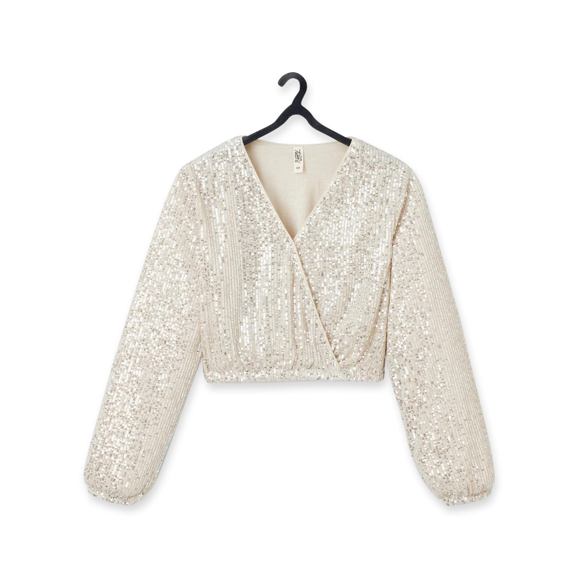 Craquez pour ce magnifique chemisier à sequins argentés ! Parfait pour les fêtes ! Avec ses manches longues et ses sequins argentés recyclés, il apporte de l’éclat à toutes les tenues. Le col croisé à l’avant avec bouton-pression ajoute une touche élégante, tandis que la taille et les poignets ajustés créent une silhouette chic.
