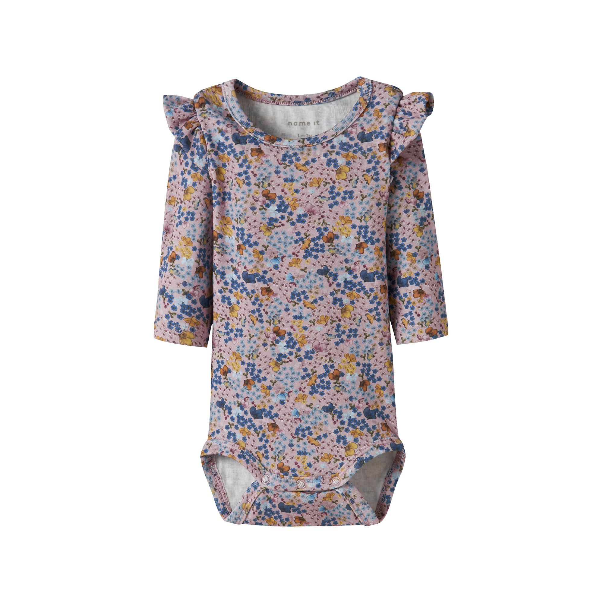 Apportez de la fraîcheur à la garde-robe de votre enfant avec ce body doux et pratique, à porter toute l’année. Le tricot côtelé avec motif rayé vertical offre élasticité, confort et style intemporel, tandis que les volants et l’imprimé sur toute la surface ajoutent une touche ludique.