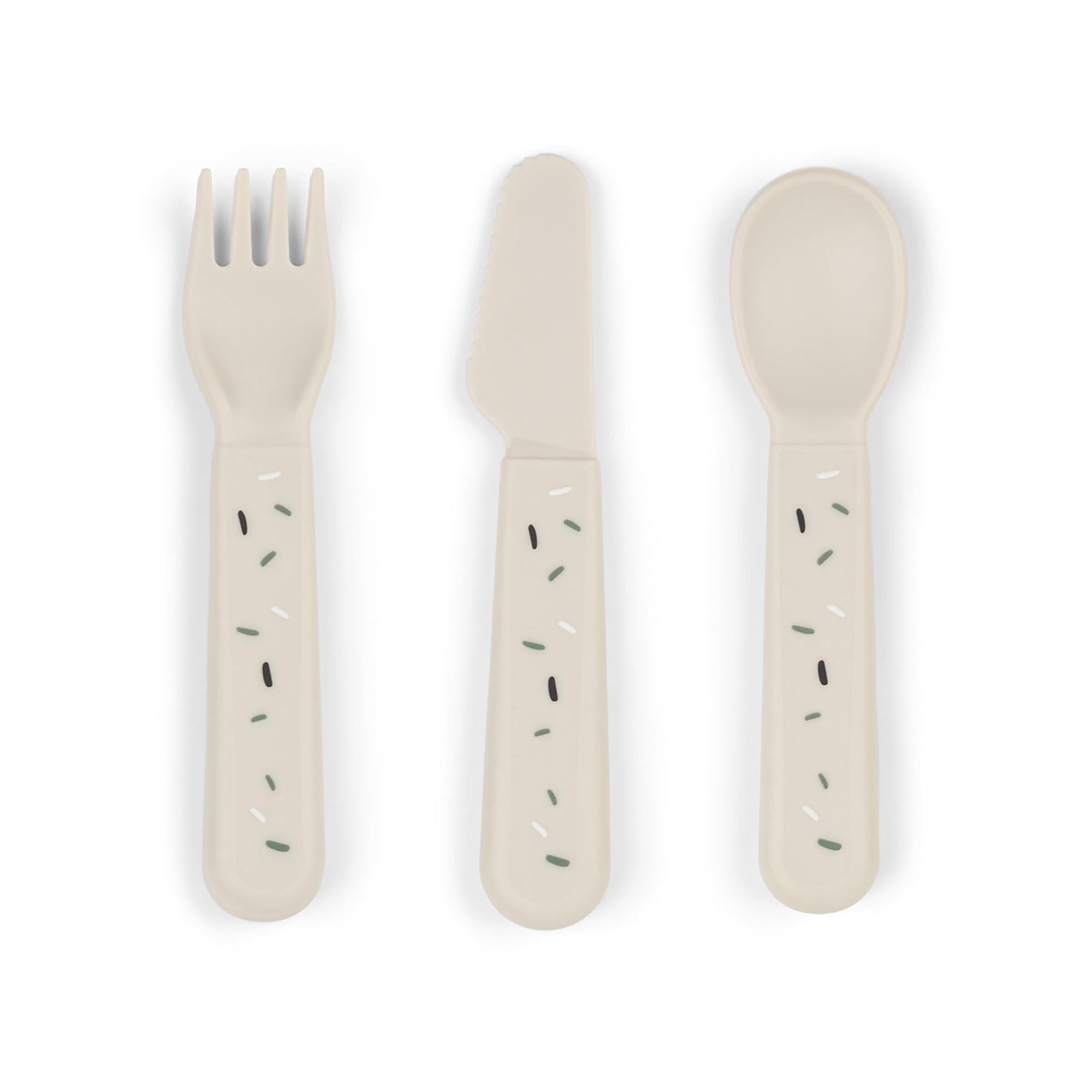 L’ensemble de couverts pour enfants Foodie de couleur sable de Done by Deer a des bords doux et arrondis et est idéal pour les petites mains qui s’entraînent à manger de manière autonome. La cuillère, la fourchette et le couteau sont robustes et légers et peuvent être recyclés à la fin – parfaits pour les petites XXX