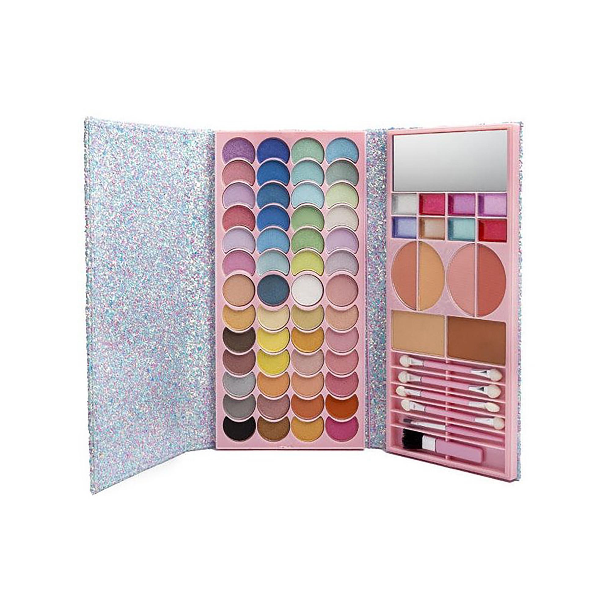 Contenu : 52 couleurs d'ombres à paupières, 8 couleurs de gloss, 6 fards à joues et bronzers, 4 pinceaux applicateurs et 2 brosses