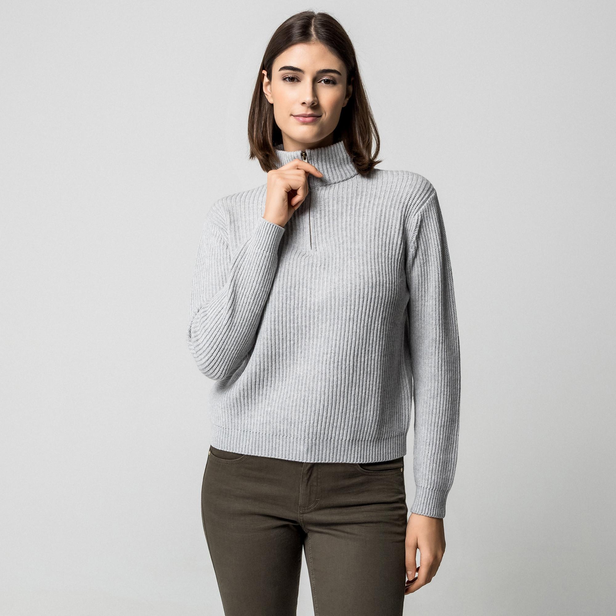 Ce pull est fabriqué dans un mélange agréablement doux de laine et de coton. Il est de couleur unie et côtelé, avec un col roulé avec une fermeture éclair courte.