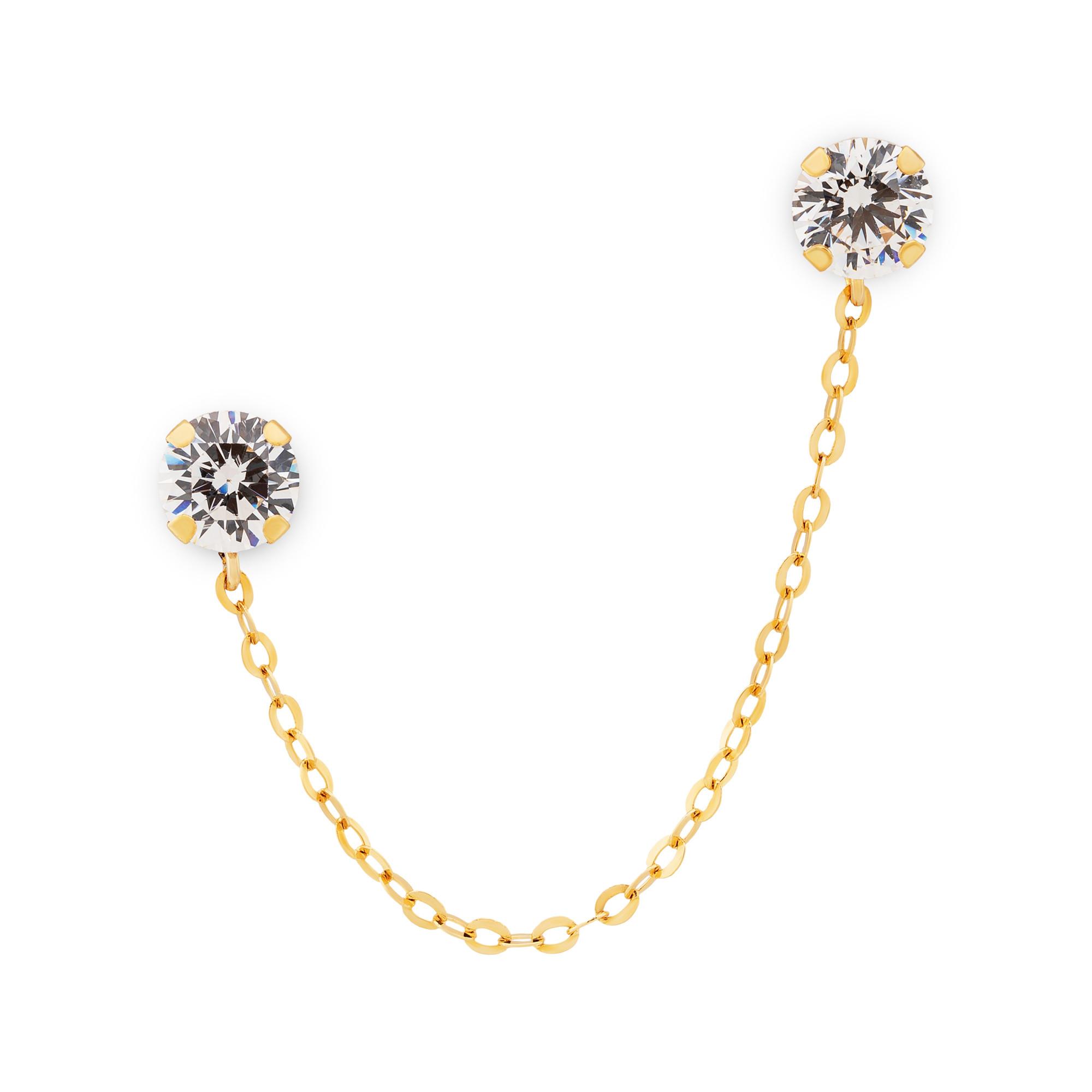 Ces clous d’oreilles doubles de L’Atelier Gold 18 Karat by Manor combinent deux pierres de zirconium à facettes à monture translucide avec une chaîne filigrane – un bijou discret qui crée des accents élégants.