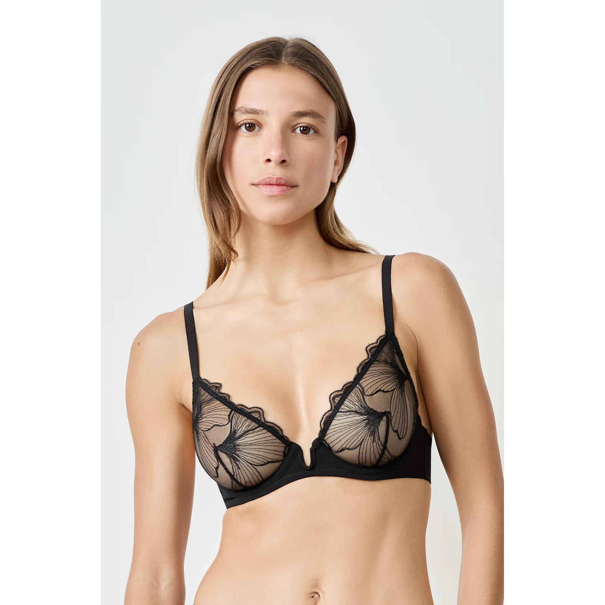 Ce soutien-gorge à armatures séduit par sa fine broderie, délicatement brodée sur un tulle transparent. L’encolure en V entre les bonnets met en valeur le décolleté, tandis que les armatures offrent une forme naturelle.