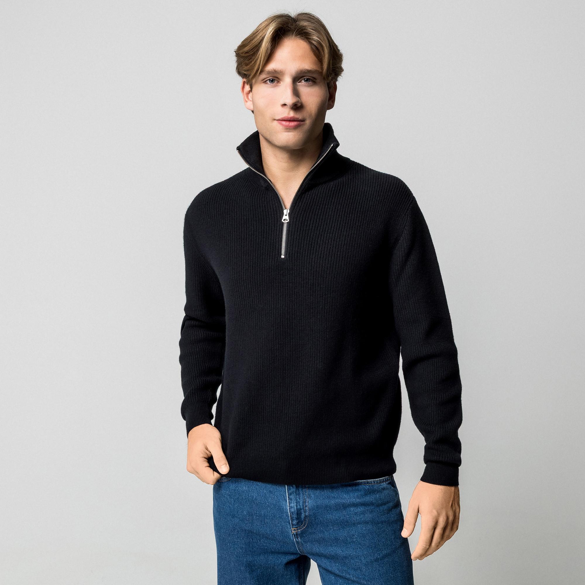 Ce pull est fabriqué dans un mélange de fils doux de laine mérinos avec 30% de coton – un basique simple avec une coupe classique. Le pull en maille a un col montant avec une fermeture éclair courte et des manches longues avec des bandes côtelées.