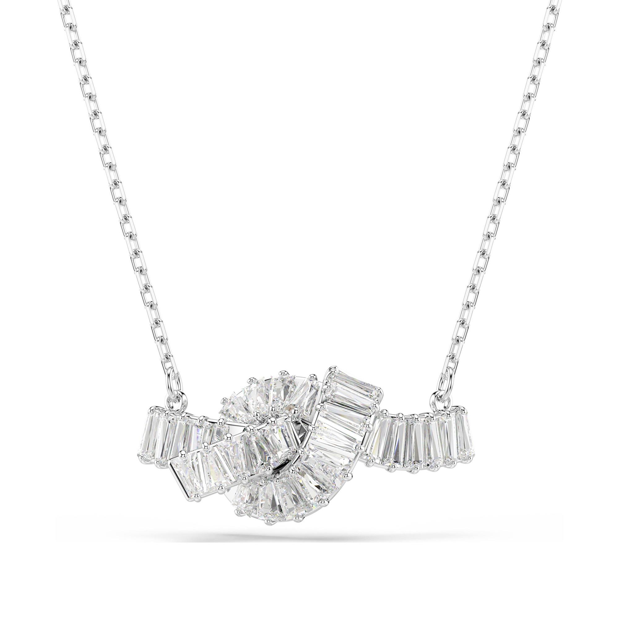Cet élégant pendentif de la collection Matrix de Swarovski symbolise la connexion éternelle avec son motif de nœud. La surface rhodiée et les pierres de zirconium Swarovski à sertissage à griffes de taille baguette confèrent une élégance intemporelle à ce bijou. Nœud en tant que symbole de cohésion Pierres de zirconium radieuses de taille baguette Chaîne réglable avec fermoir mousqueton