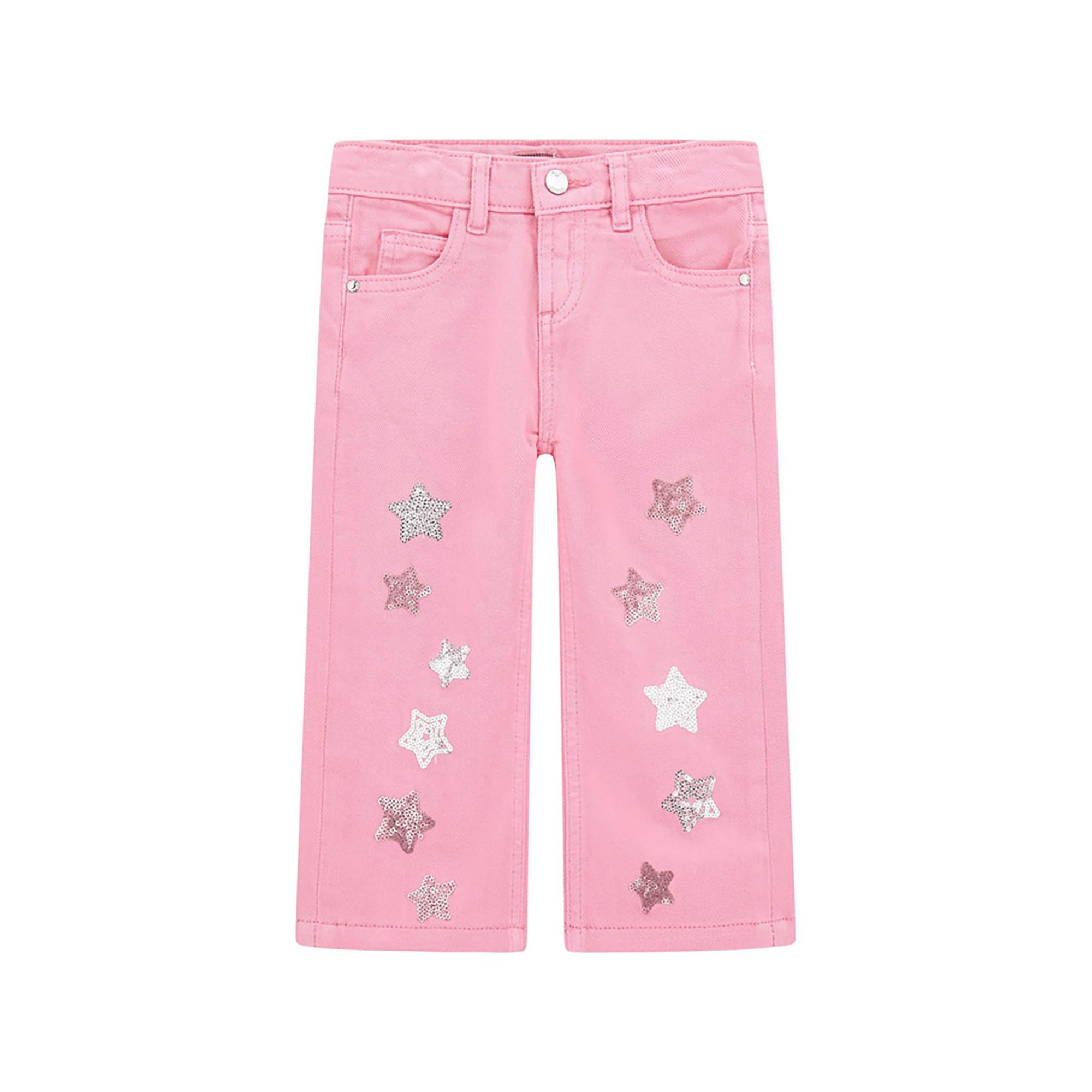 Ce pantalon pour enfants signé GUESS séduit par sa jambe évasée et ses étoiles en paillettes sur le devant. Des poches pratiques à l’avant et à l’arrière ainsi qu’un logo discret à l’arrière ajoutent une touche stylée. Confectionné en 100 % coton, il offre confort et élégance au quotidien.