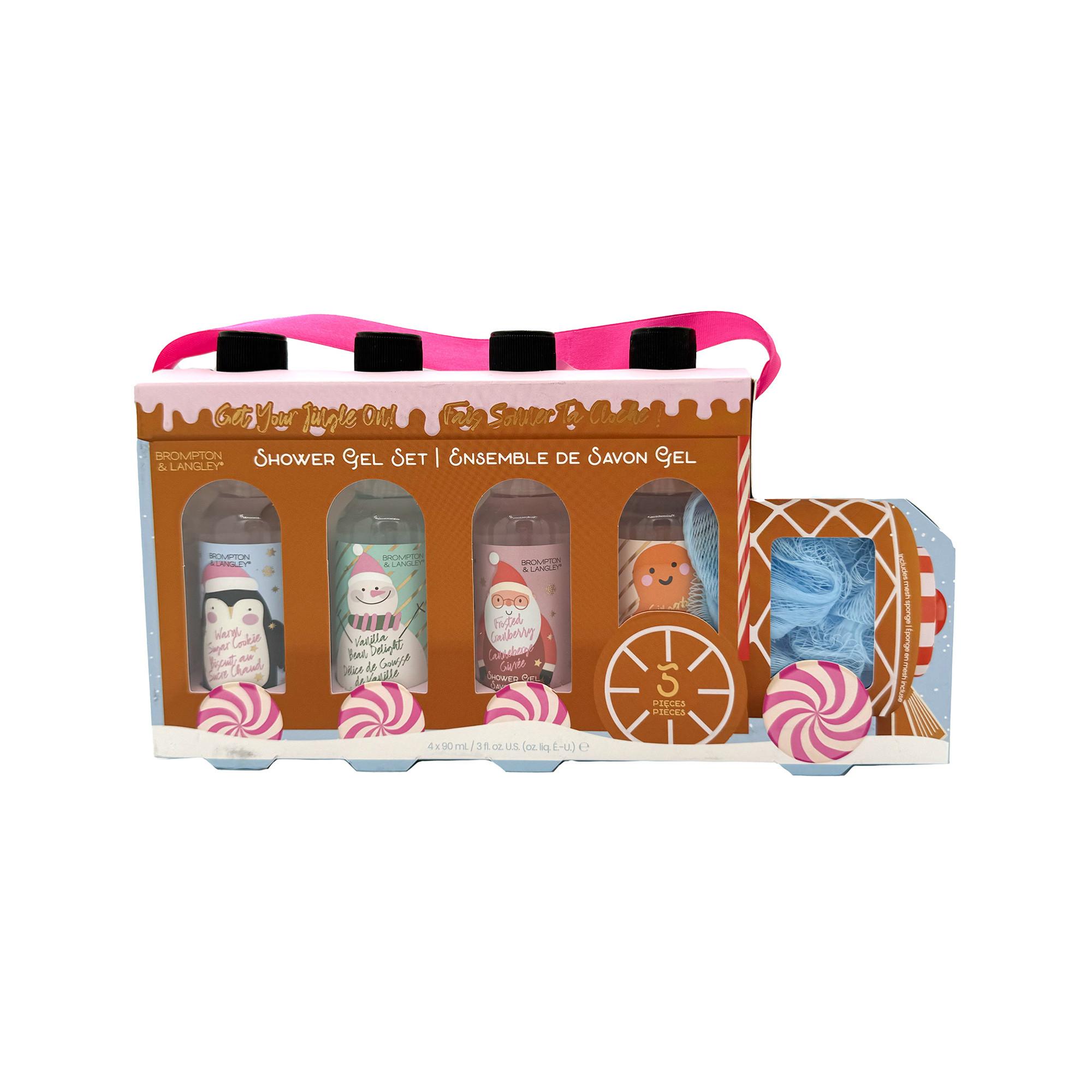 5Pc Shower Gel Set W/ Bath Pouf - Gingerbread Train: Un joli ensemble de cinq gels douche accompagné d'un gant de bain, offrant un délicieux parfum pour une douche festive.