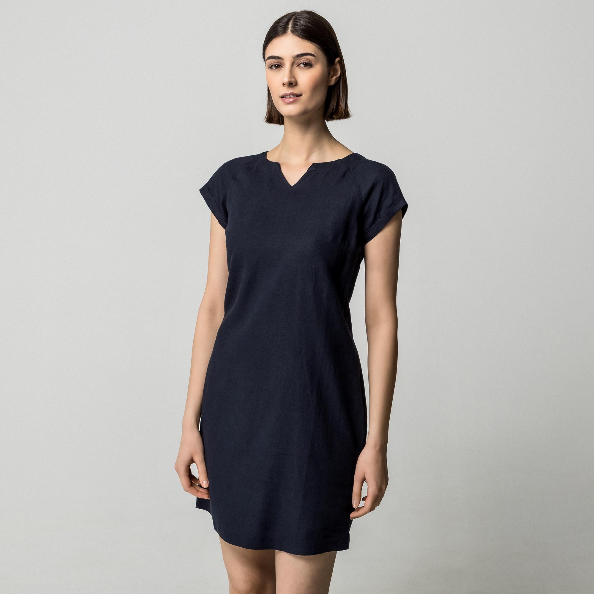 Cette robe en lin offre un look intemporel et tendance. Le design présente un décolleté en V et des manches courtes, offrant une option confortable et polyvalente pour diverses occasions.