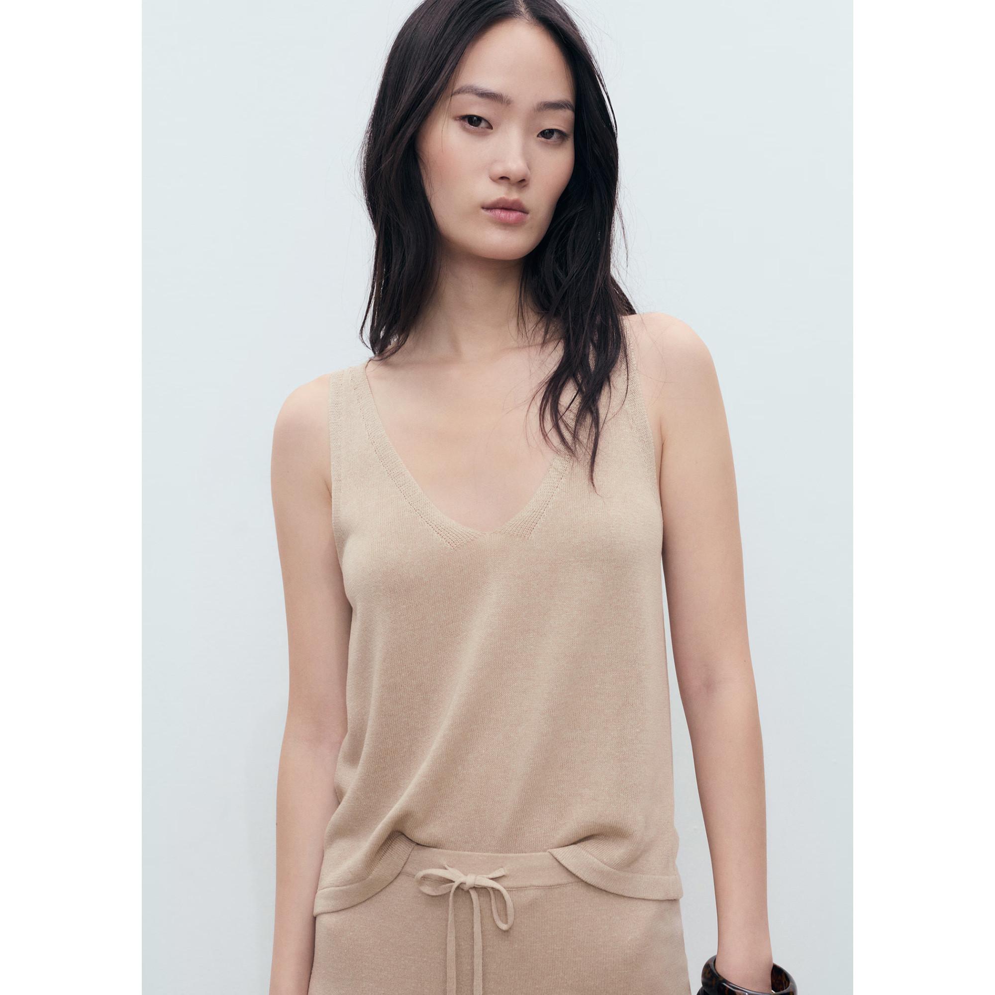 Ce top en maille fine à coupe droite présente un élégant décolleté en V. Il est sans manches et doté de larges bretelles, parfait pour un look féminin et épuré au quotidien.