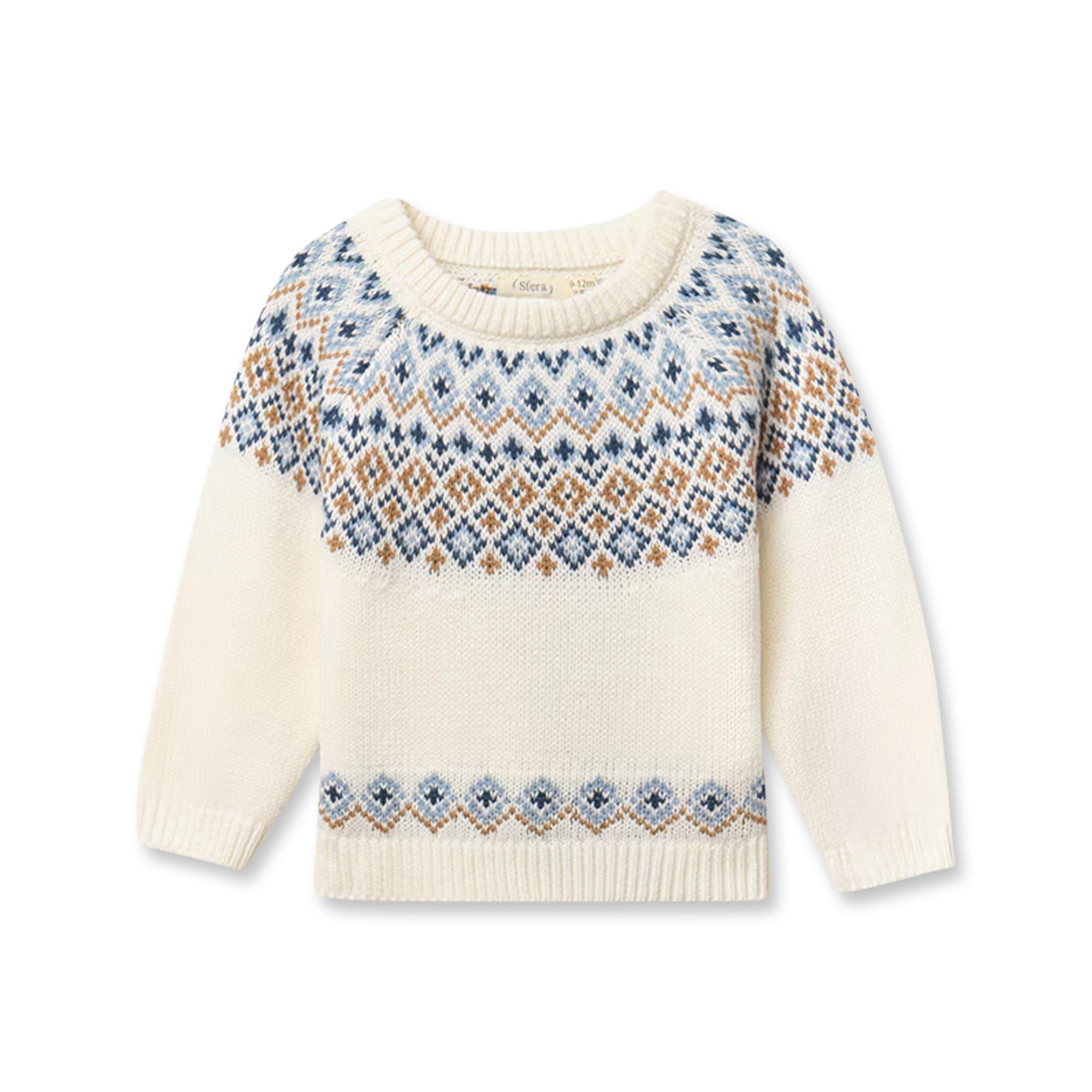 Le pull jacquard Sfera pour bébé est confectionné dans un mélange doux de coton et d’acrylique. Il présente un col rond classique, des manches longues et un motif jacquard élégant, idéal pour les journées fraîches. Facile d’entretien et confortable pour un maximum de bien-être. [shaws.ie]