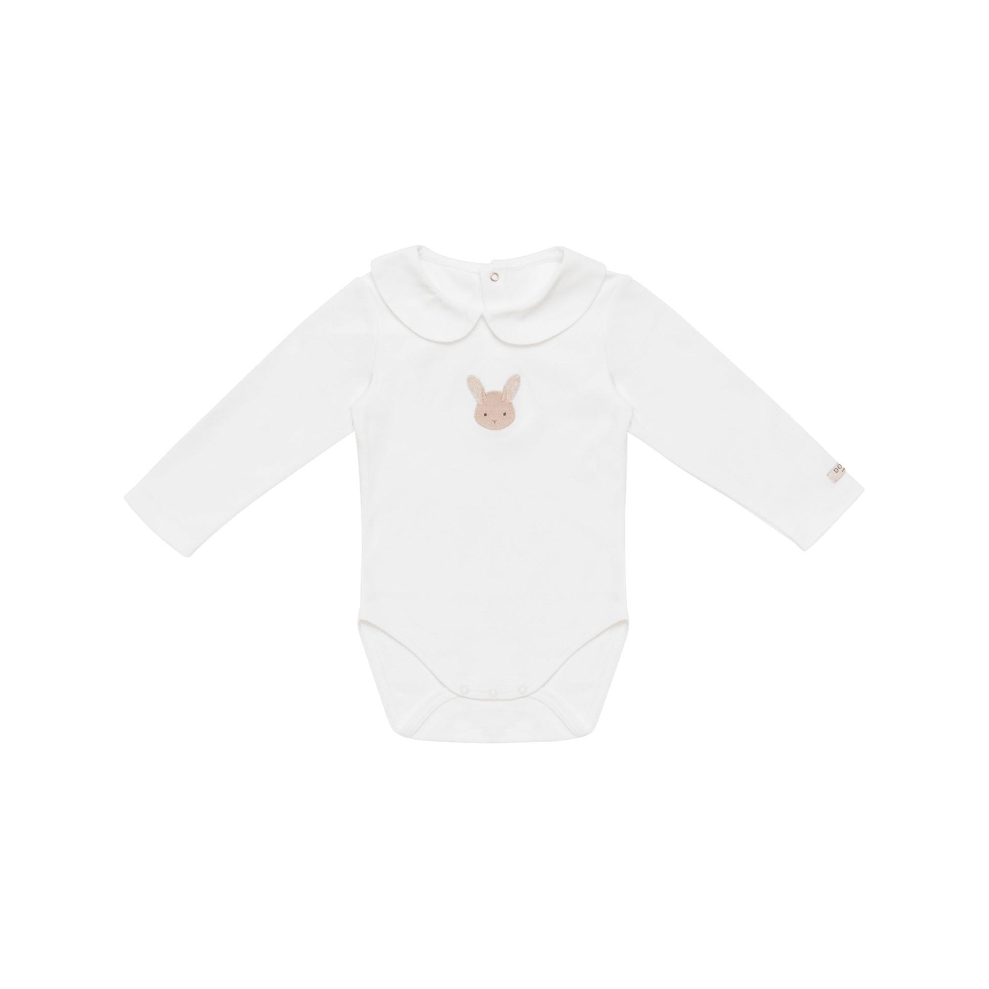 Adorable body pour bébé signé Donsje avec col Claudine et appliqué lapin sur la poitrine. Conçu en matière douce et de qualité, avec boutons-pression pratiques pour un habillage facile. Parfait pour un look élégant et confortable.