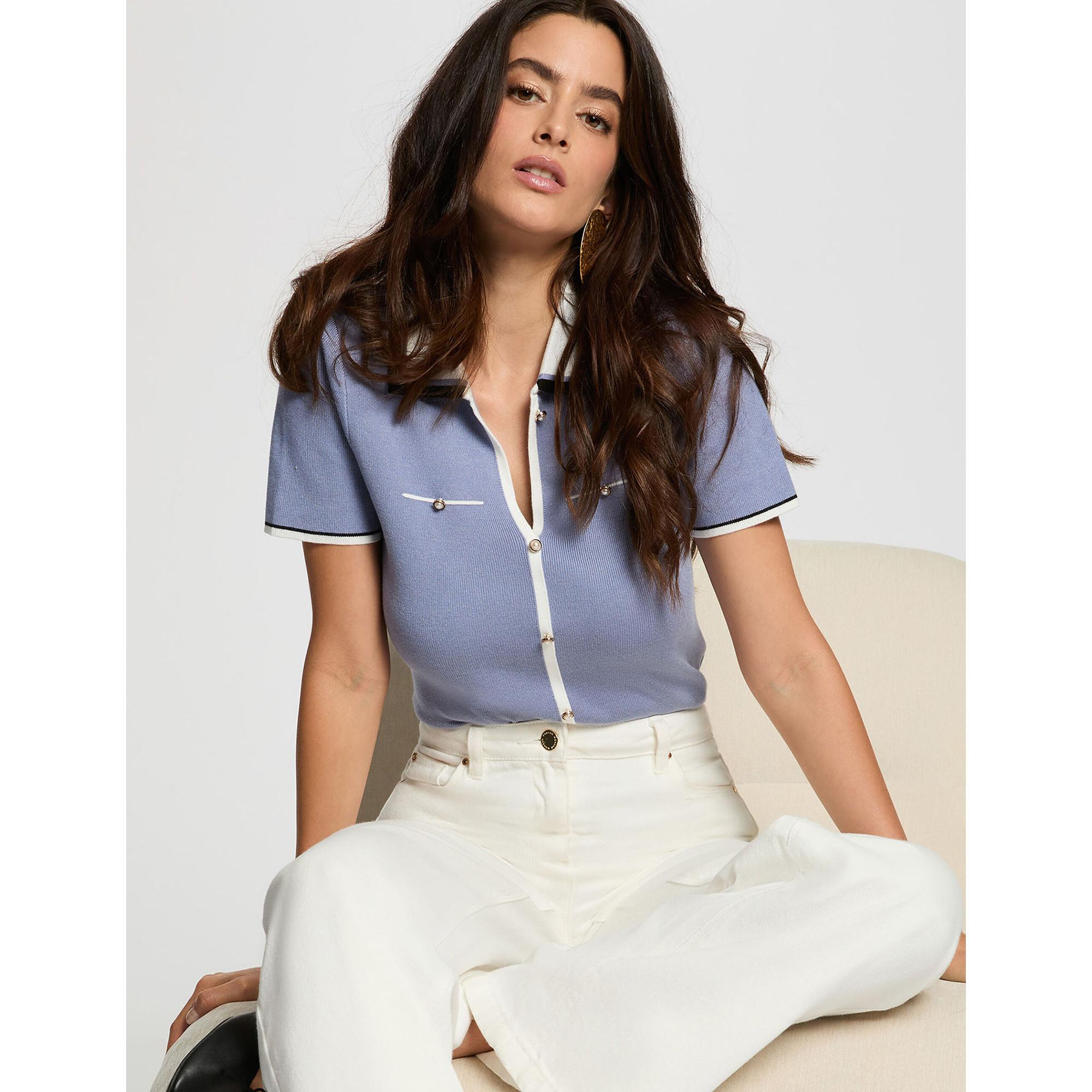 Ce pull à manches courtes de Morgan, de style polo, est doté d'un col classique et d'une maille fine. La coupe ajustée met en valeur la silhouette tout en offrant un confort optimal. Il est parfait pour un look casual soigné avec une touche sportive.