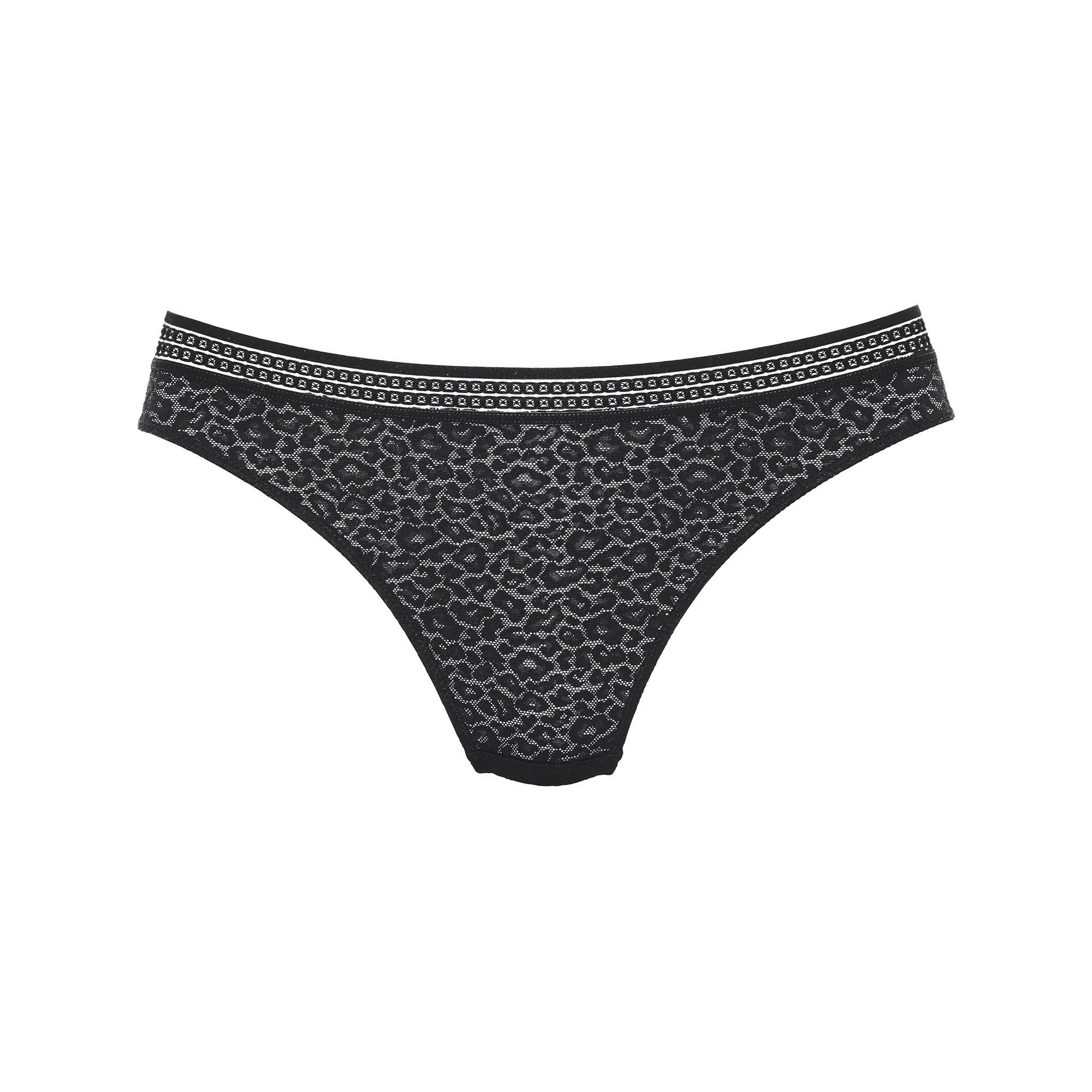 Ce string séduit par sa ceinture rayée tendance et sa dentelle transparente à motif léopard. Le gousset en coton intégré assure un confort optimal. À assortir avec le bralette coordonné de la même collection.