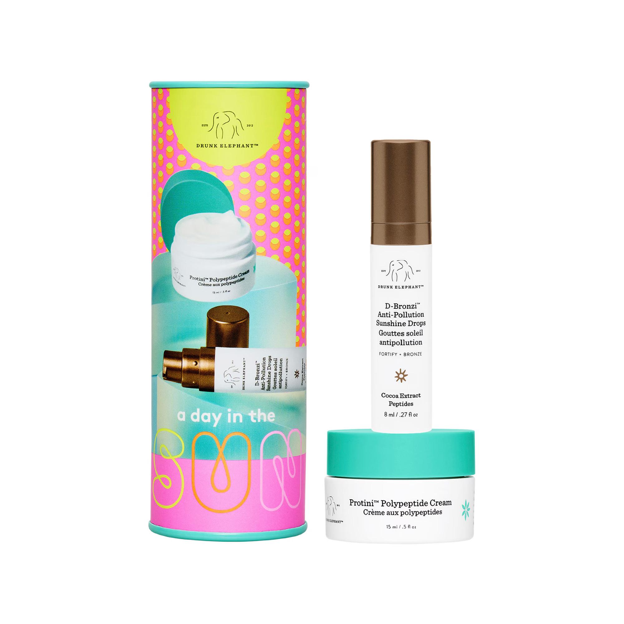 Le coffret A Day in the Sun de Drunk Elephant est un duo de soins qui se compose de la crème hydratante visage Protini et des gouttes bronzantes D-Bronzi.