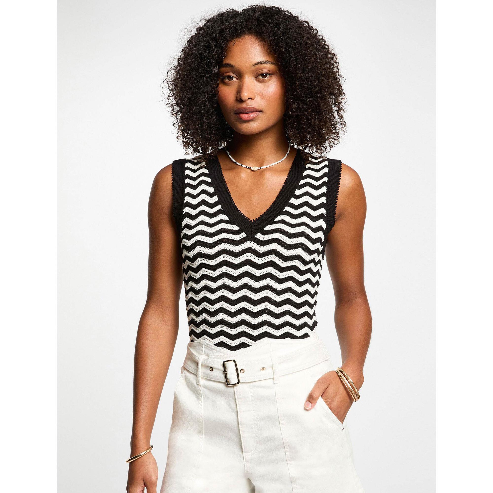 Ce top sans manches Morgan présente une coupe ajustée et un motif chevron graphique. L’encolure en V souligne la ligne épurée et apporte une touche contemporaine. Il est parfait pour des tenues variées au style citadin.
