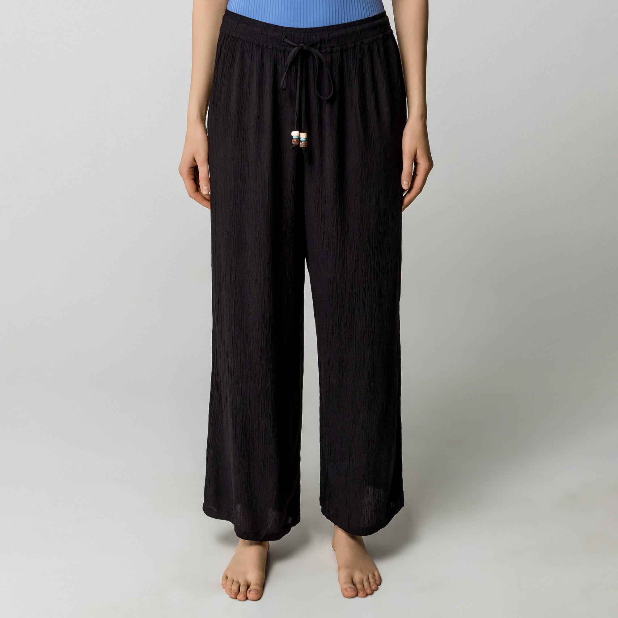 Ce pantalon large froissé offre une coupe décontractée et confortable, parfaite pour diverses occasions décontractées. La taille élastique avec cordon de serrage assure un ajustement sûr et réglable, tandis que les perles décoratives sur le cordon ajoutent une touche de charme bohème.