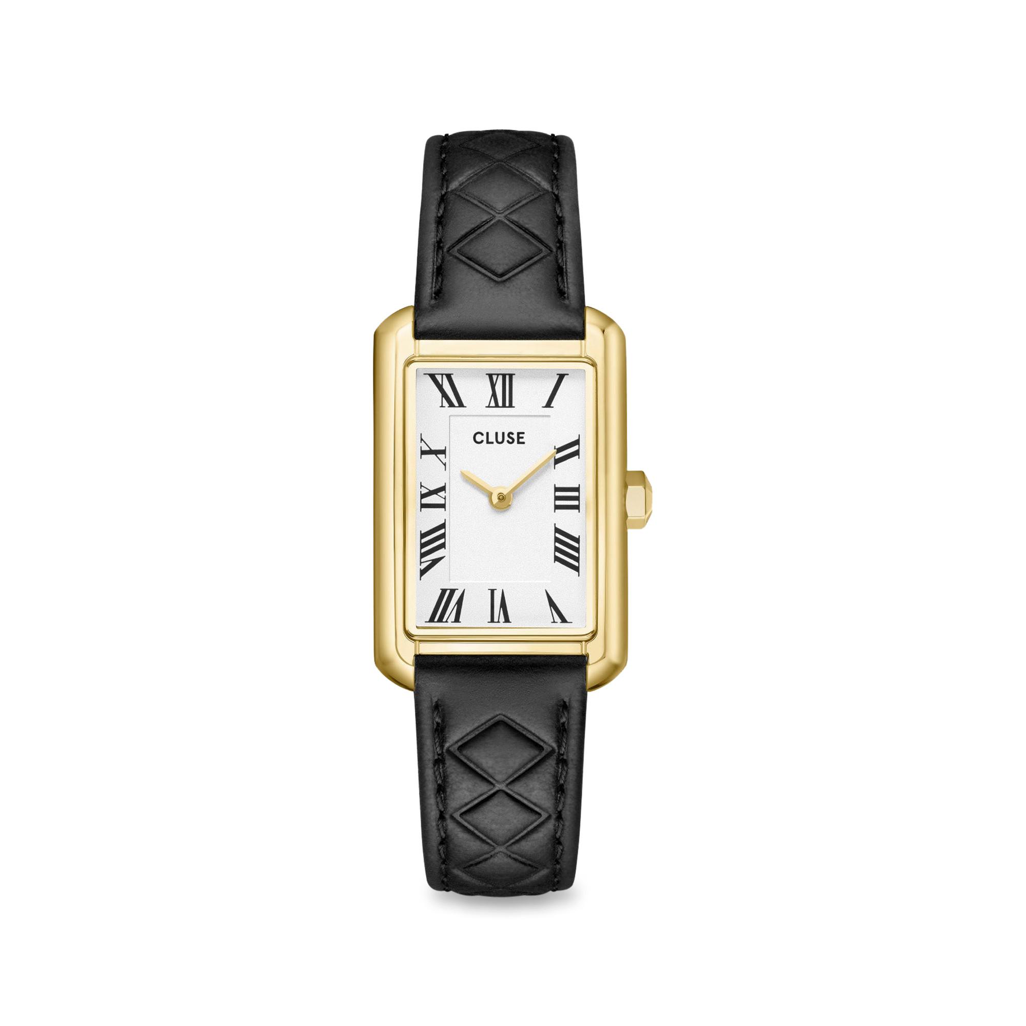 Avec la Belisenna, la marque Cluse présente une montre pour femmes élégante avec un boîtier rectangulaire de 21 mm en or et un bracelet en cuir matelassé noir. Le cadran blanc assure un aspect intemporel et complète parfaitement le design élégant. boîtier rectangulaire, 21 mm bracelet en cuir noir, 14 mm cadran blanc classique