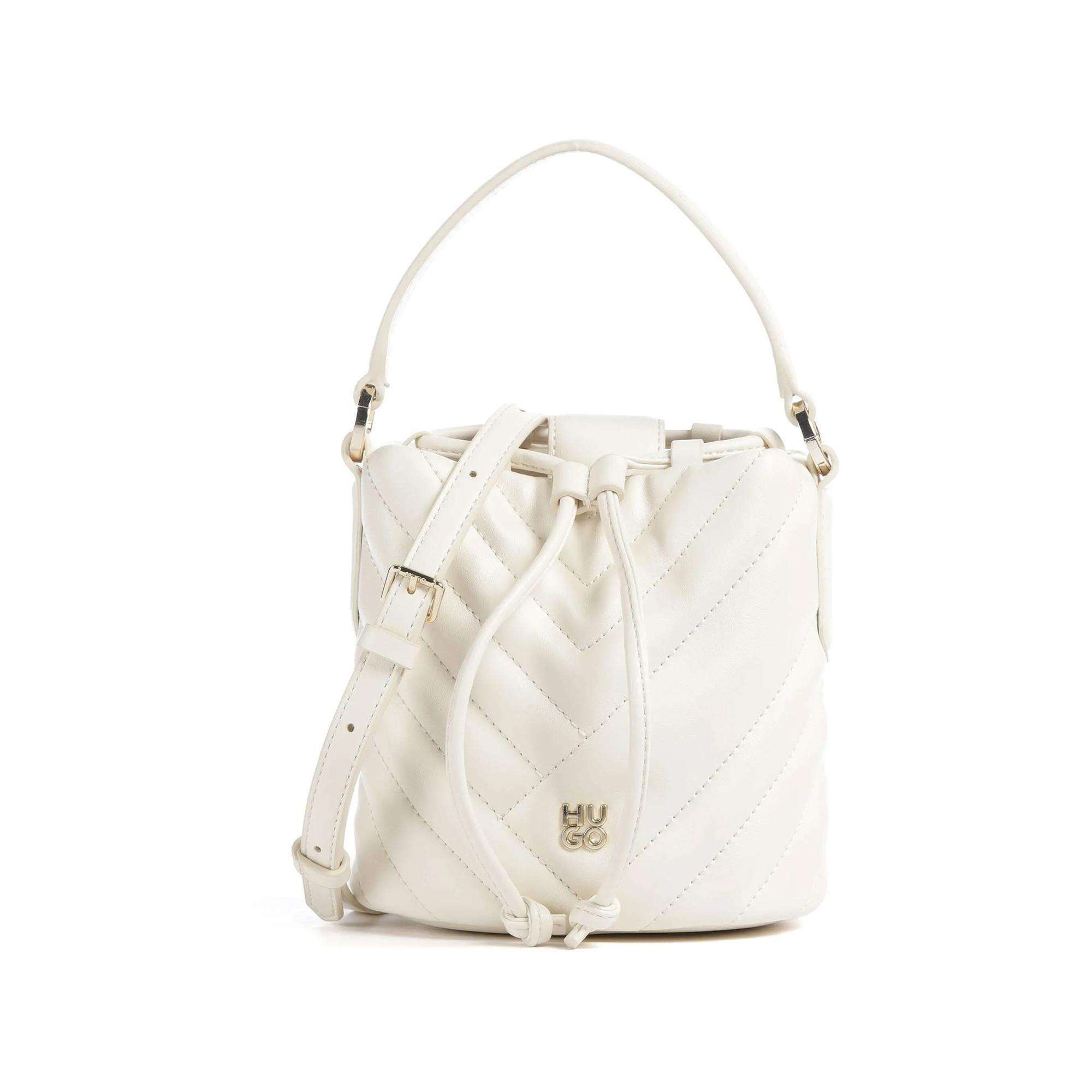 Ce sac seau présente un design matelassé et une fermeture à cordon, offrant un moyen élégant et sécurisé de transporter les essentiels. Le sac est orné d'un logo sur le devant, ajoutant une touche de reconnaissance.