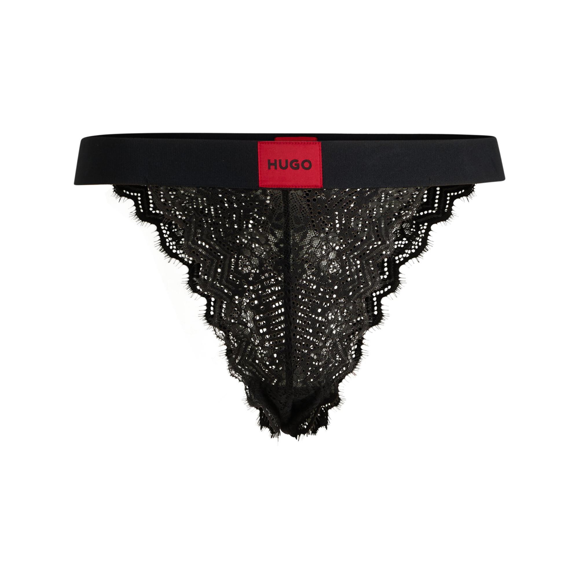 Ce slip présente de délicats détails en dentelle, offrant un look sophistiqué et élégant. Le design comprend une ceinture élastique confortable avec le logo Hugo bien visible sur un patch rouge, ajoutant une touche de marque distinctive.