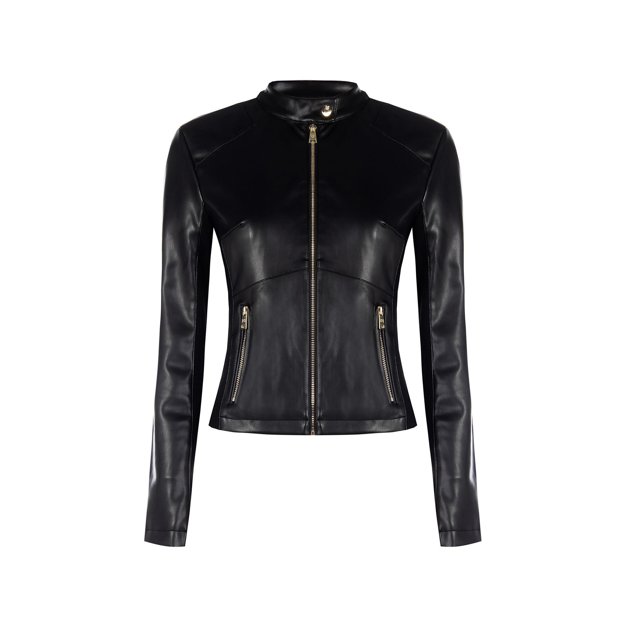 Cette veste biker en similicuir présente un design élégant avec un col montant et une fermeture éclair sur toute la longueur. Les détails dorés ajoutent une touche d'élégance, tandis que les poches zippées offrent un rangement pratique. Le dos de la veste comprend des empiècements contrastants pour une silhouette raffinée.