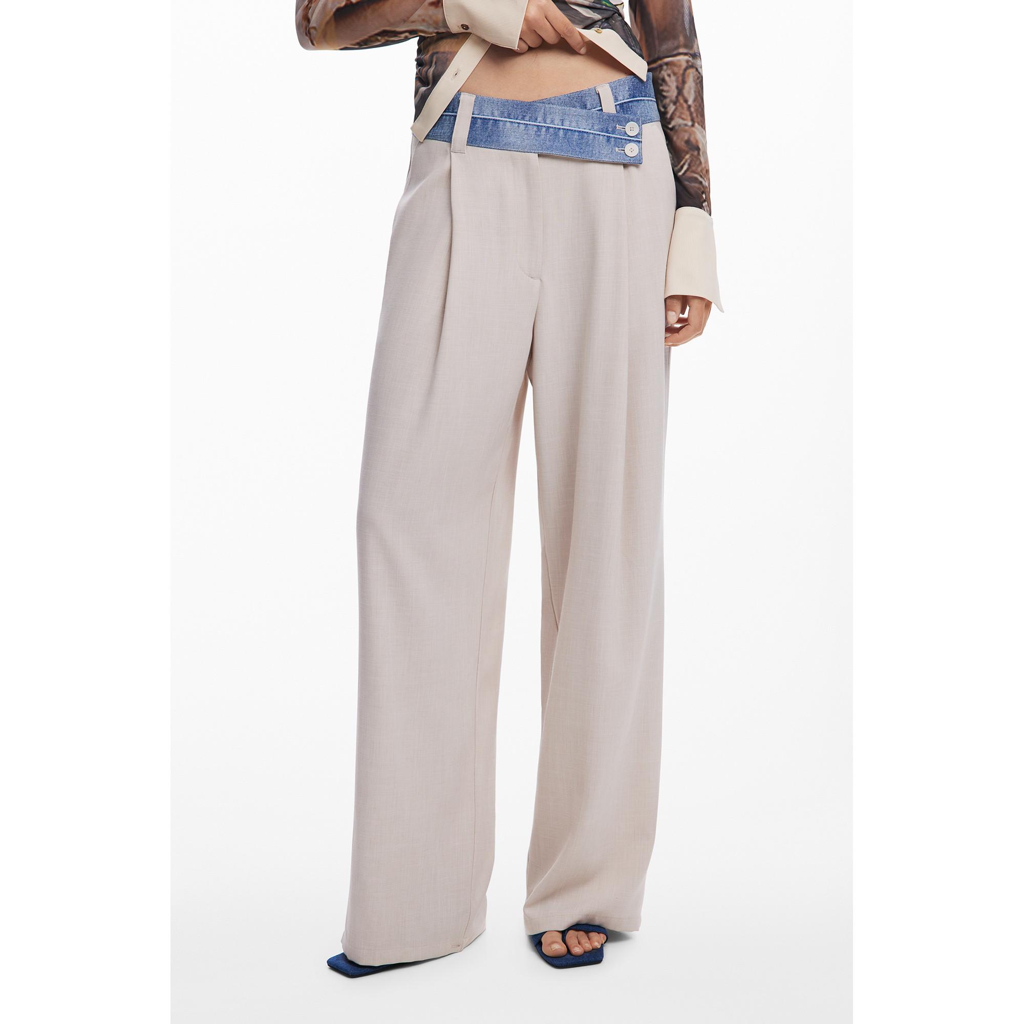 Le pantalon Desigual associe un tissu fluide à des détails en denim au niveau de la taille et présente une coupe droite. Il est doté de pinces, de passants de ceinture, de poches latérales et d’une fermeture éclair avec bouton. Confectionné en polyester recyclé pour un look moderne et polyvalent.