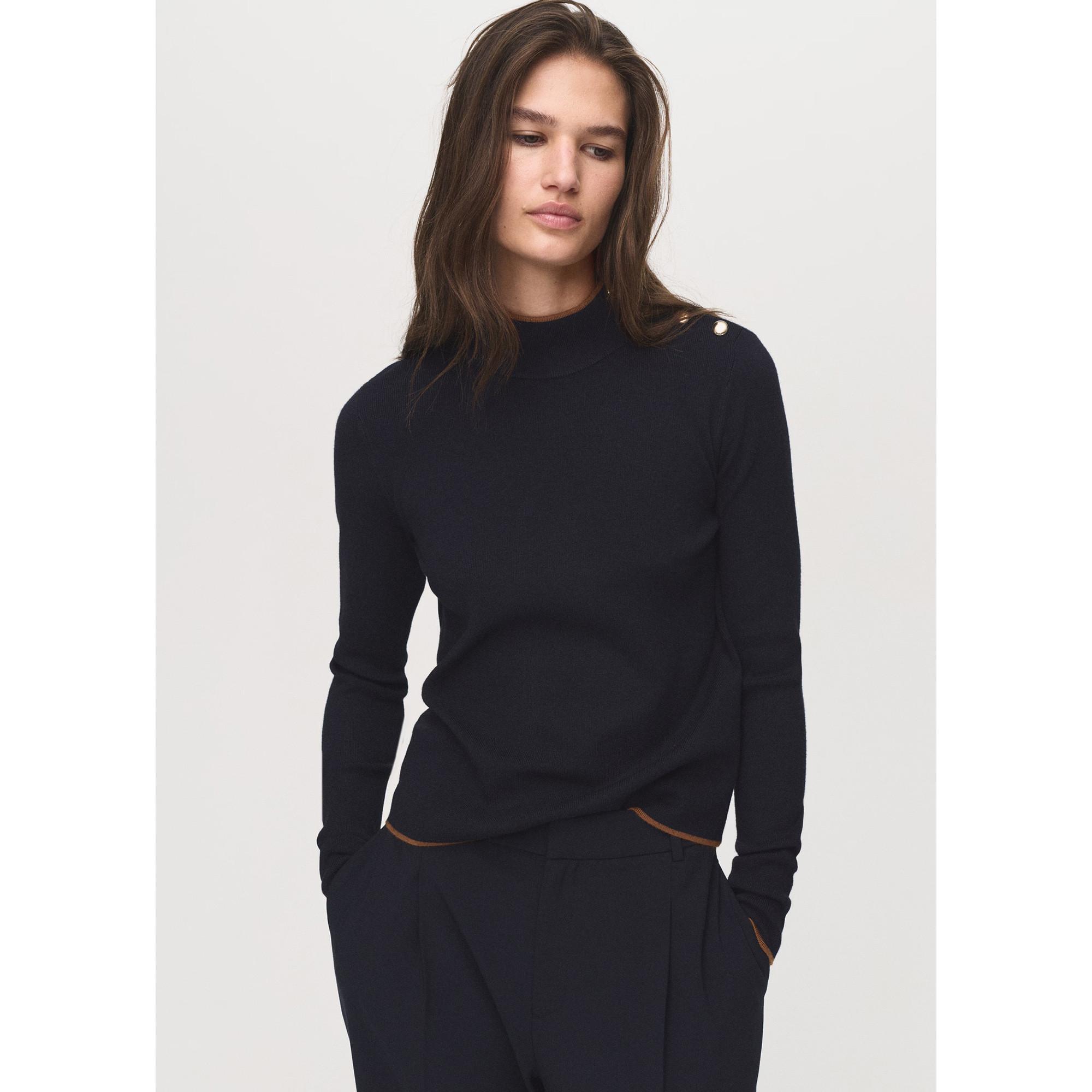 Ce modèle droit en maille fine présente un col montant élégant et des manches longues. Les finitions contrastantes et la fermeture à boutons sur l’épaule apportent une touche originale.