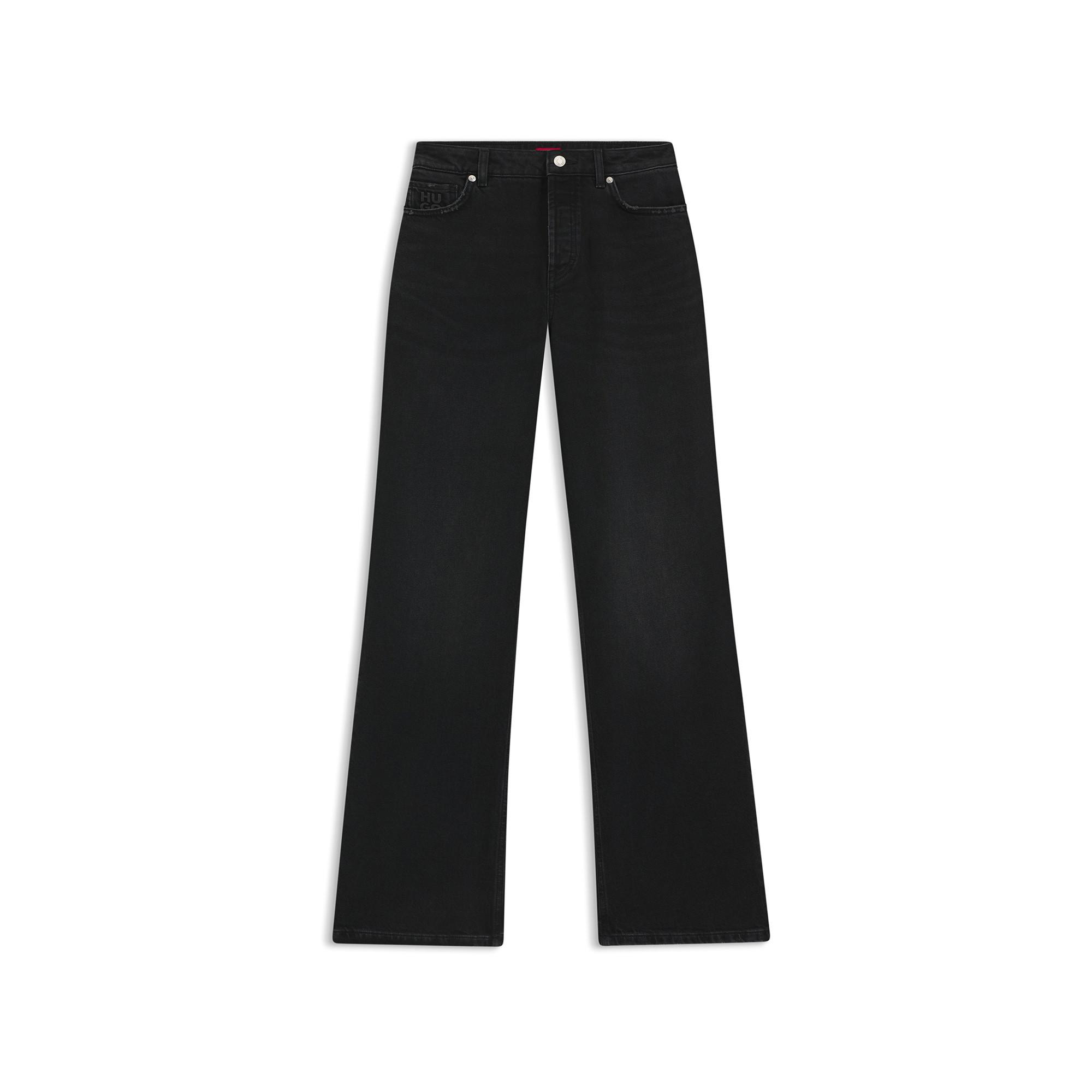 Ce jean Hugo taille haute à jambes larges allie confort et style contemporain. Le denim stretch noir offre une coupe flatteuse, avec un logo discret sur la poche monnaie. Confectionné en coton régénératif – pour une mode responsable et tendance.