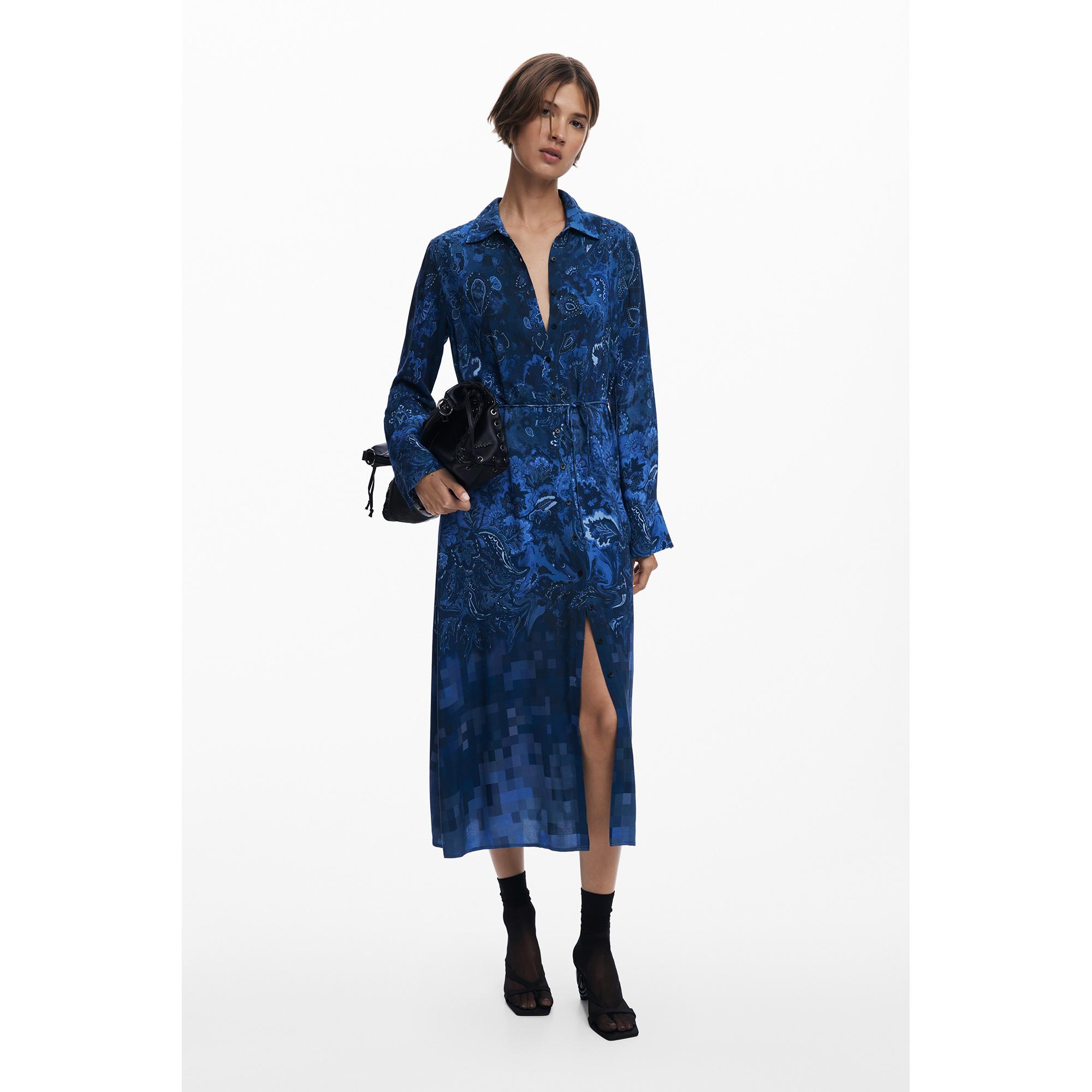 Cette robe chemise Desigual séduit par sa coupe ample, son col classique et sa fermeture boutonnée sur toute la longueur. Ses manches longues et sa longueur midi en font un choix parfait pour le quotidien. Confectionnée en 100 % viscose, elle offre une sensation de légèreté et de confort.