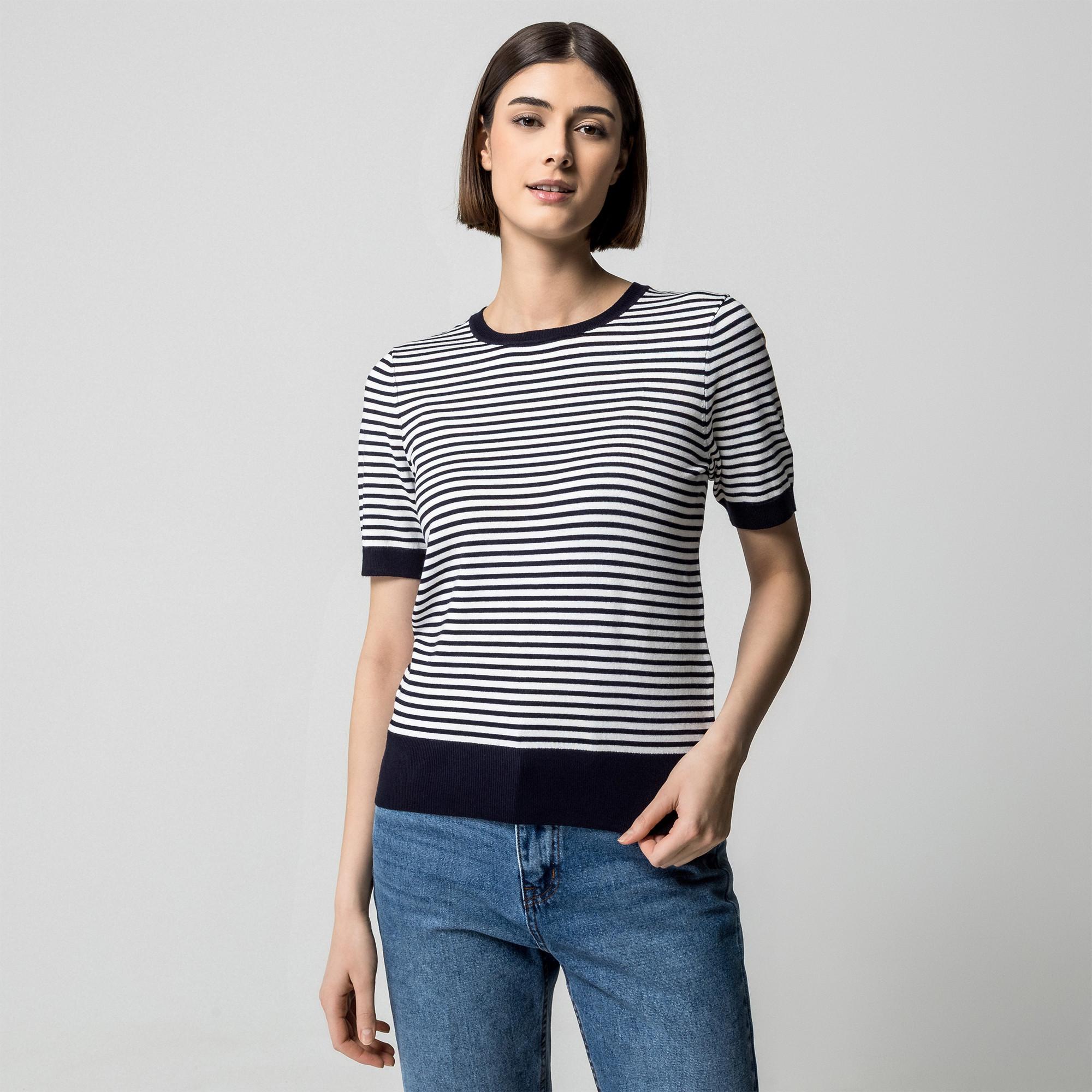 Ce t-shirt de Manor Woman est fabriqué à partir de matériaux écologiquement durables et contient des fibres qui portent le label écologique de l'UE. Il a une coupe régulière et a un motif rayé cool et de jolis boutons à la nuque. Le tissu est très doux et agréable sur la peau. Le t-shirt a une encolure ronde côtelée et des poignets côtelés.