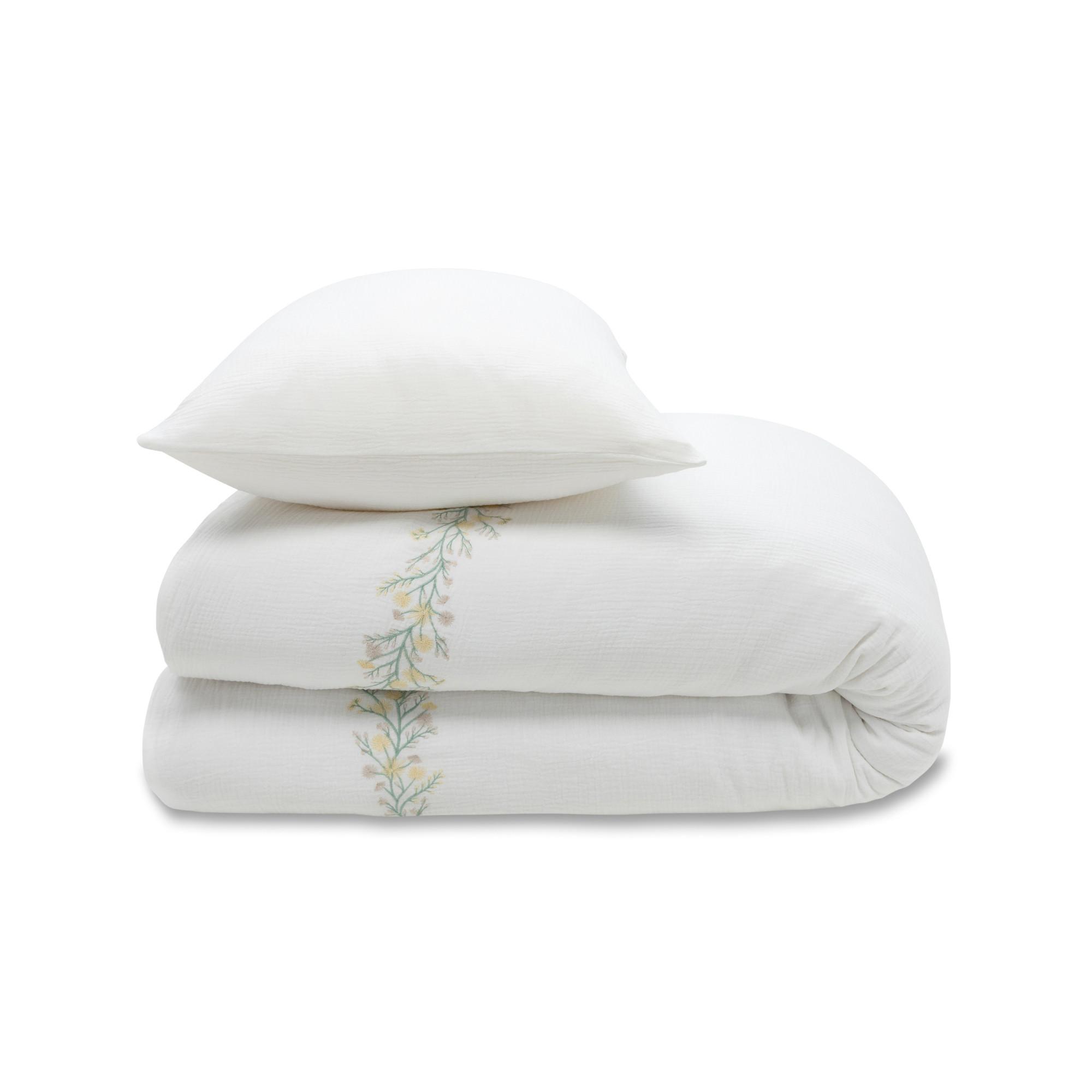 Cette housse de couette est fabriquée en mousseline douce et adhérente. Les broderies discrètes, associées à la structure tissée naturelle de la matière perméable à l’air, créent un charme rafraîchissant. La housse est fabriquée à 100 % en coton des plus fins et a une fermeture boutonnée.