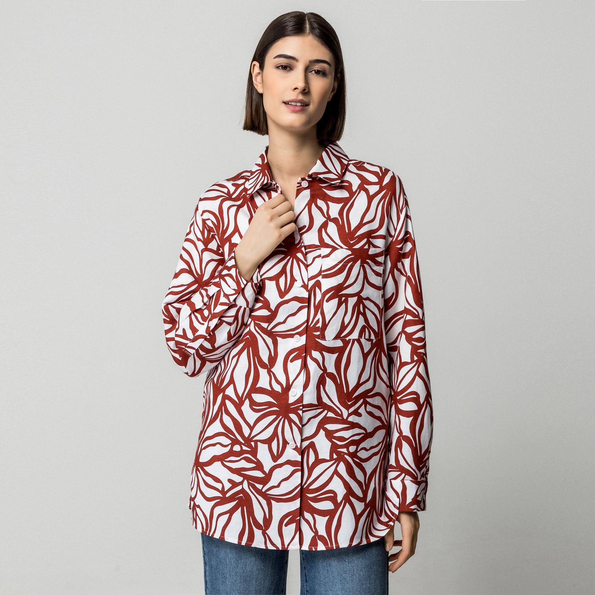 Ce chemisier à manches longues présente un motif floral saisissant, offrant un look frais et élégant. Le design comprend un col rabattu classique et une patte de boutonnage complète pour une finition soignée. Une poche poitrine ajoute un détail fonctionnel à ce haut polyvalent.