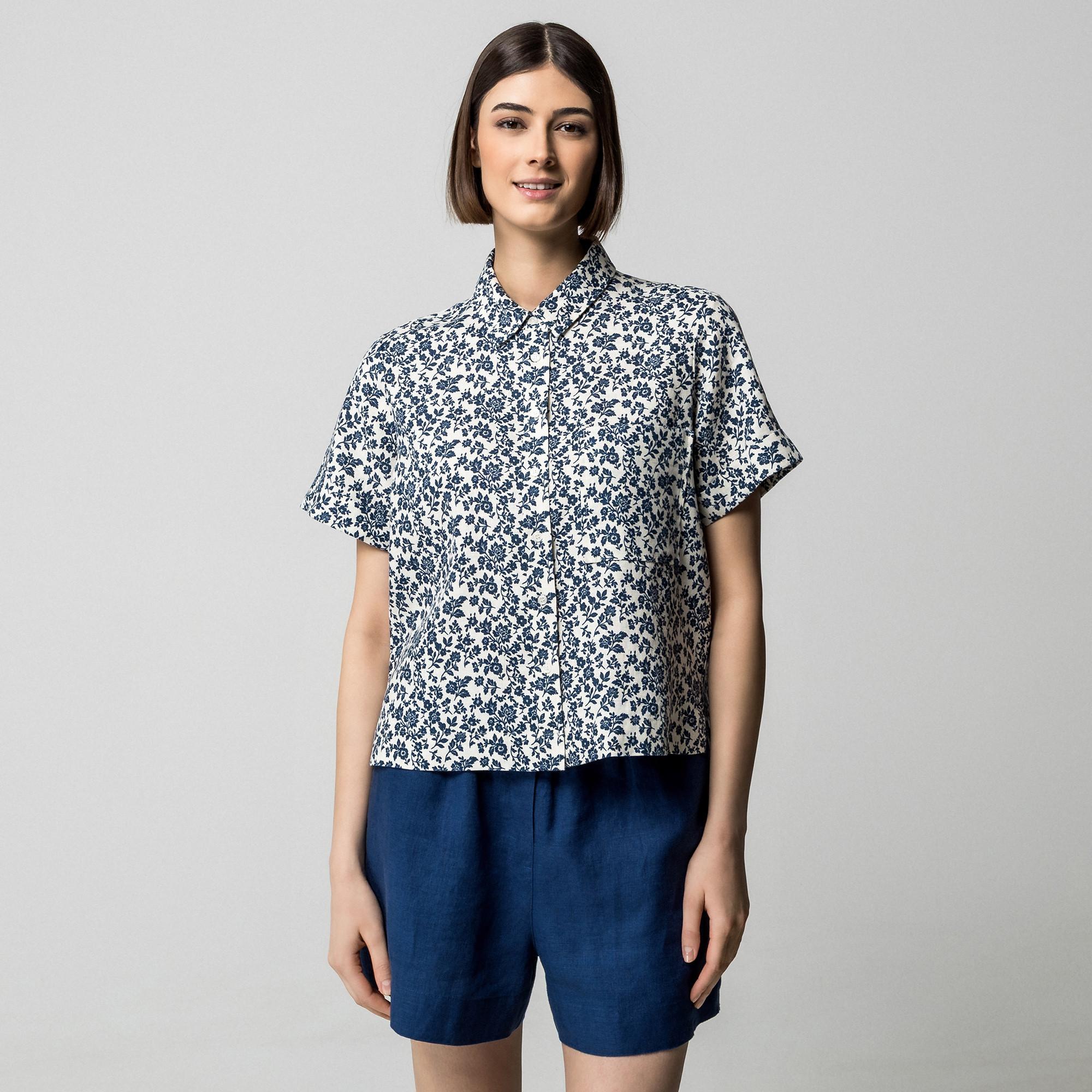 Ce chemisier à manches courtes présente un charmant motif floral, offrant un look frais et élégant. Le design comprend un col classique et une patte de boutonnage complète pour une finition soignée. La coupe décontractée assure confort et polyvalence, le rendant adapté à diverses occasions.