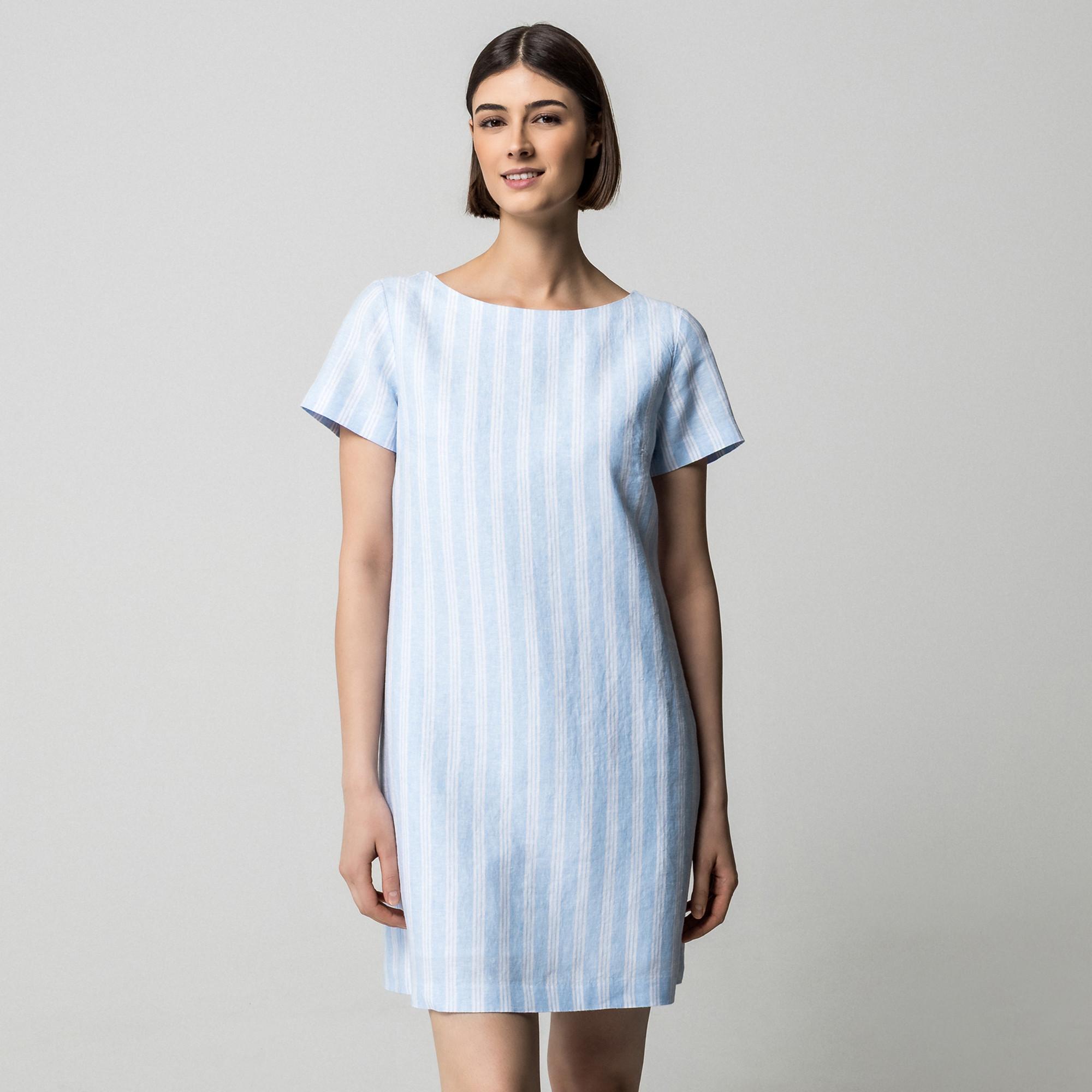 Cette robe fourreau présente un design classique avec un motif rayé moderne, ce qui en fait un ajout polyvalent à toute garde-robe. Les manches courtes et l'encolure bateau offrent une coupe confortable et élégante, adaptée à diverses occasions.