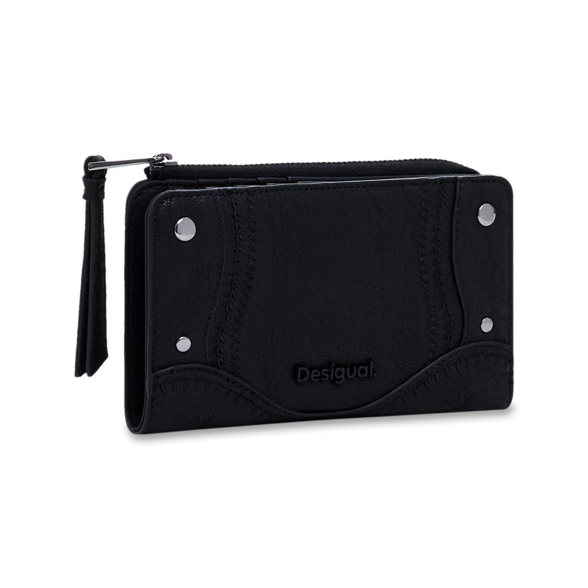 Ce portefeuille de taille moyenne séduit par ses perforations décoratives, ses bordures et ses applications métalliques. Il comprend plusieurs compartiments intérieurs, des emplacements pour cartes et une fermeture sécurisée par zip et bouton. Compact et pratique, il mesure 16 × 9.90 × 1.50 cm.