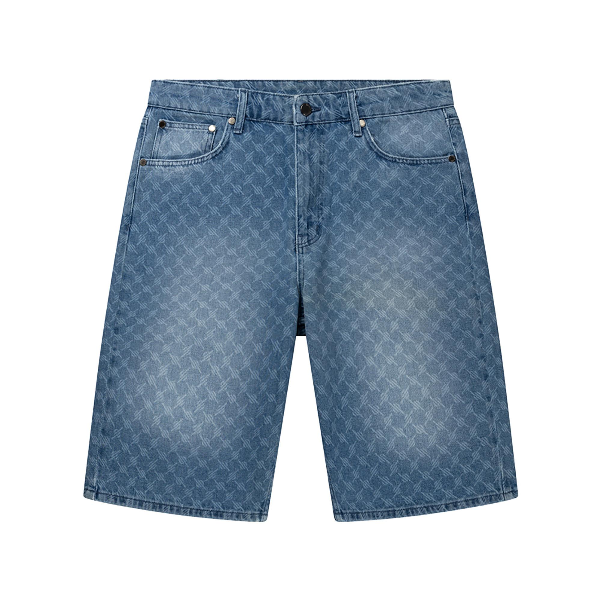 Ce short en jean présente un motif monogramme distinctif sur toute la surface, offrant un look unique et élégant. Conçu pour le confort et la polyvalence, il constitue un excellent ajout à toute garde-robe décontractée.