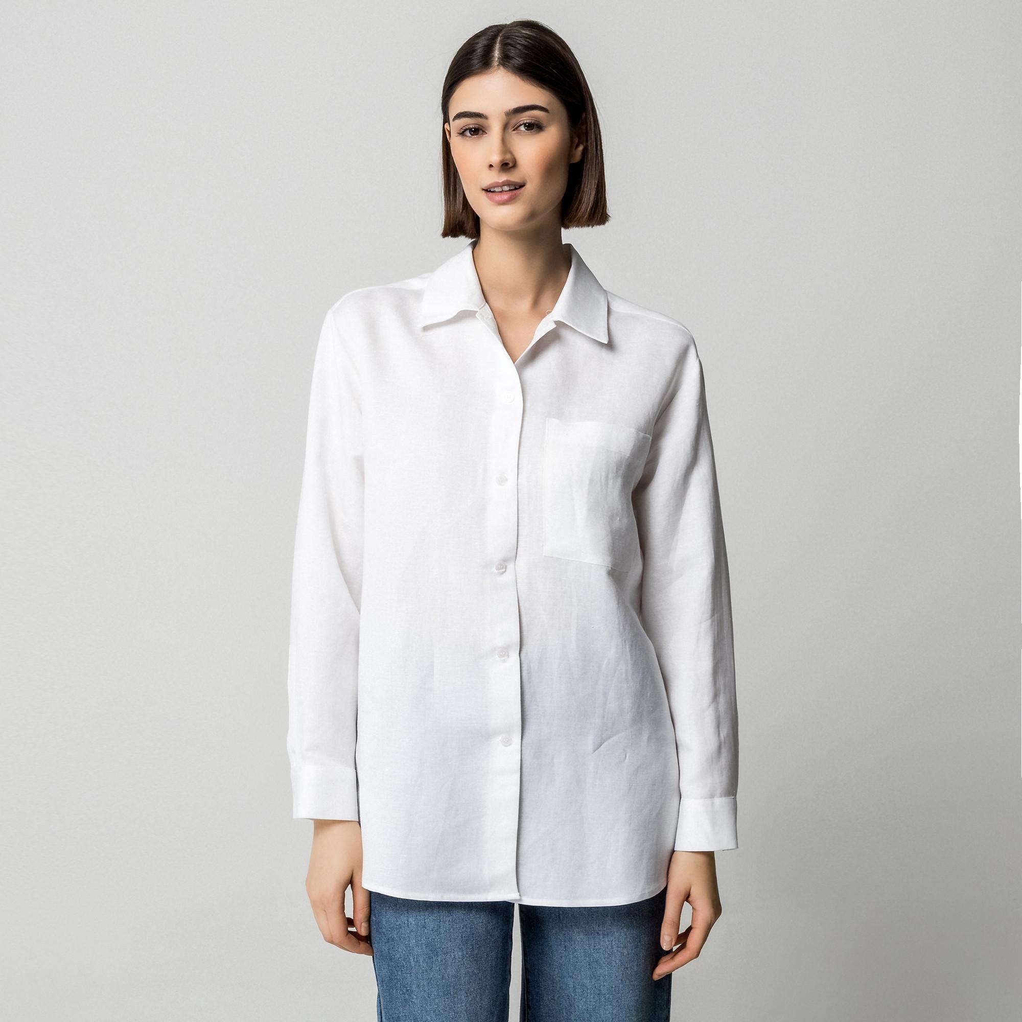 Ce chemisier à manches longues présente un design classique avec un col rabattu et une poche poitrine pratique. La patte de boutonnage sur toute la longueur permet un style polyvalent, qu'il soit porté ouvert ou fermé. Sa coupe décontractée assure confort et une silhouette moderne, ce qui en fait un ajout polyvalent à toute garde-robe.