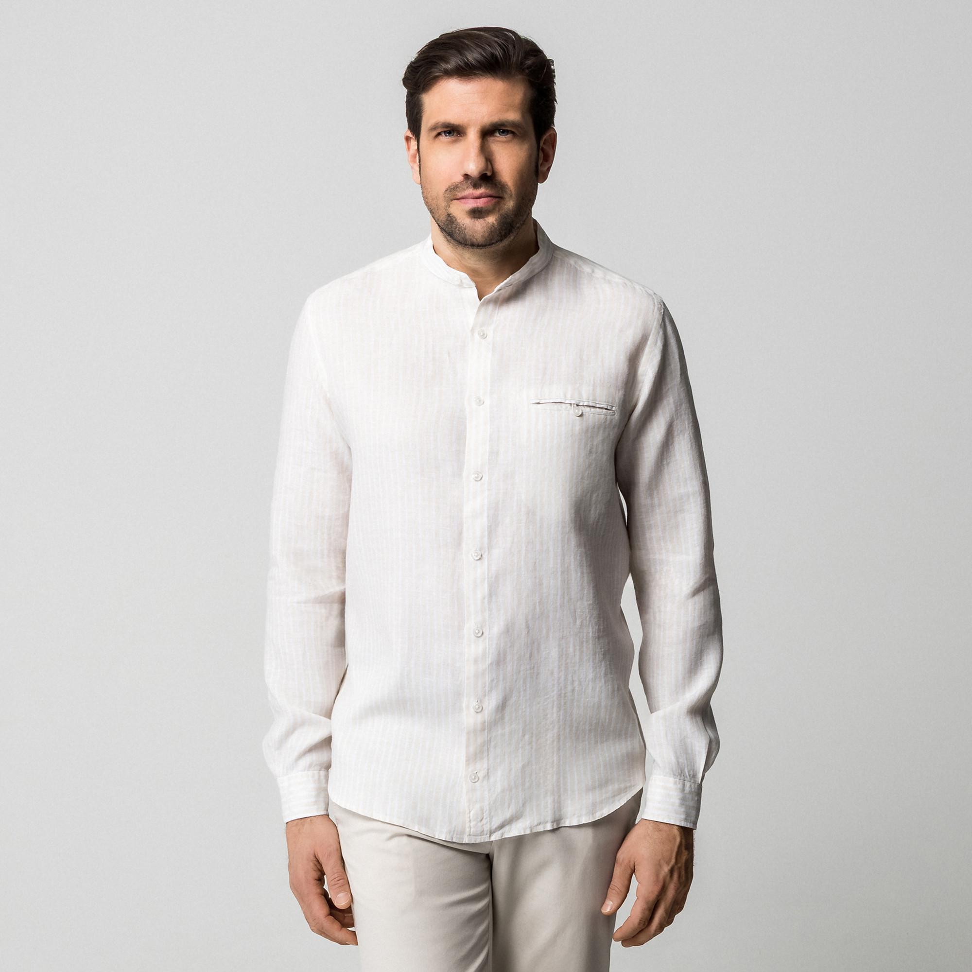 Cette chemise à manches longues présente un motif rayé classique et un col montant moderne. Le design comprend une poche poitrine avec fermeture boutonnée, ajoutant un détail fonctionnel et élégant. La patte de boutonnage sur toute la longueur assure un port facile et un look soigné.
