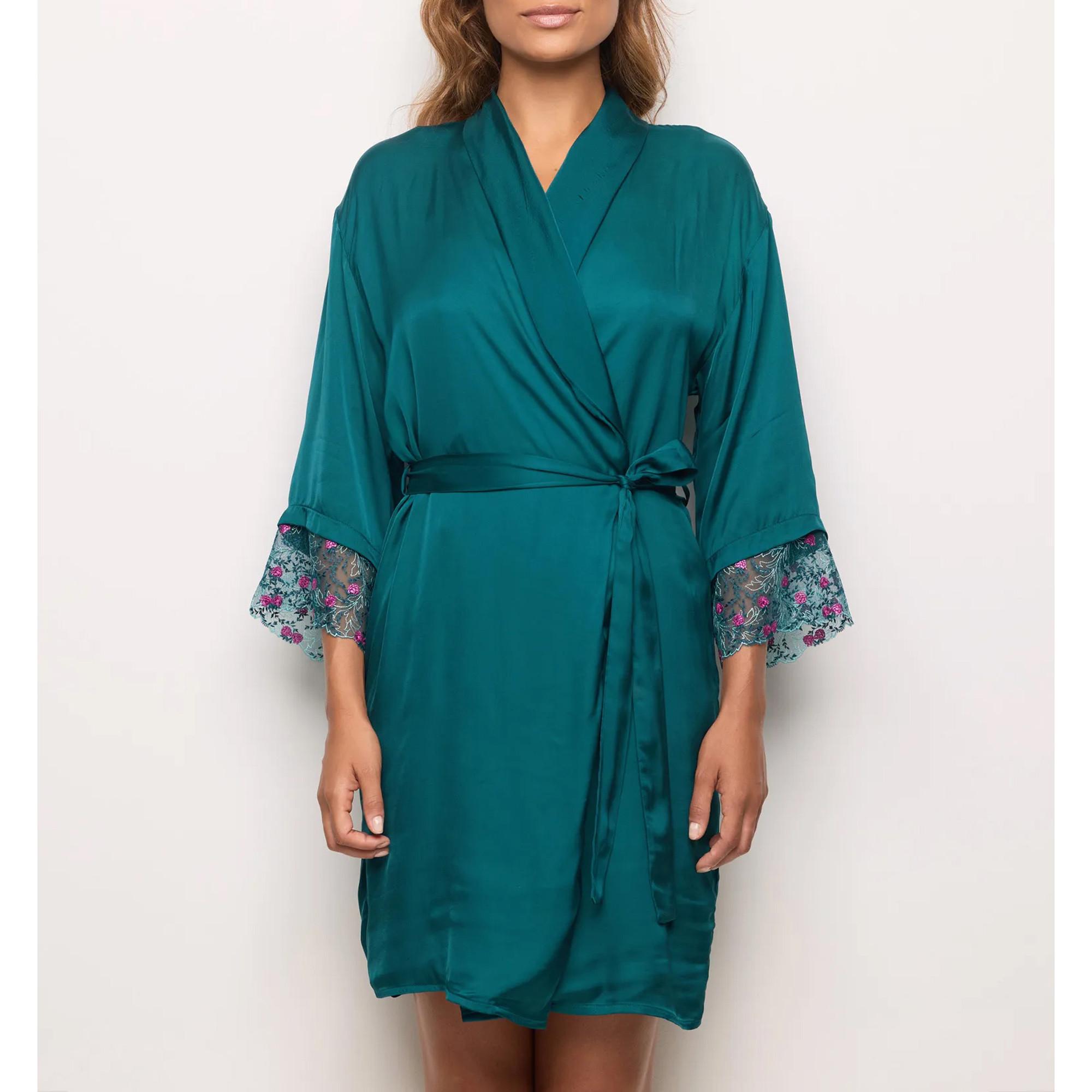 Le kimono Berry est confectionné en viscose fluide et orné de délicats détails en tulle et broderie. Son design ouvert avec ceinture à nouer crée une silhouette élégante et assure un confort optimal. Il est parfait comme pièce de homewear luxueuse ou comme complément raffiné à la lingerie.
