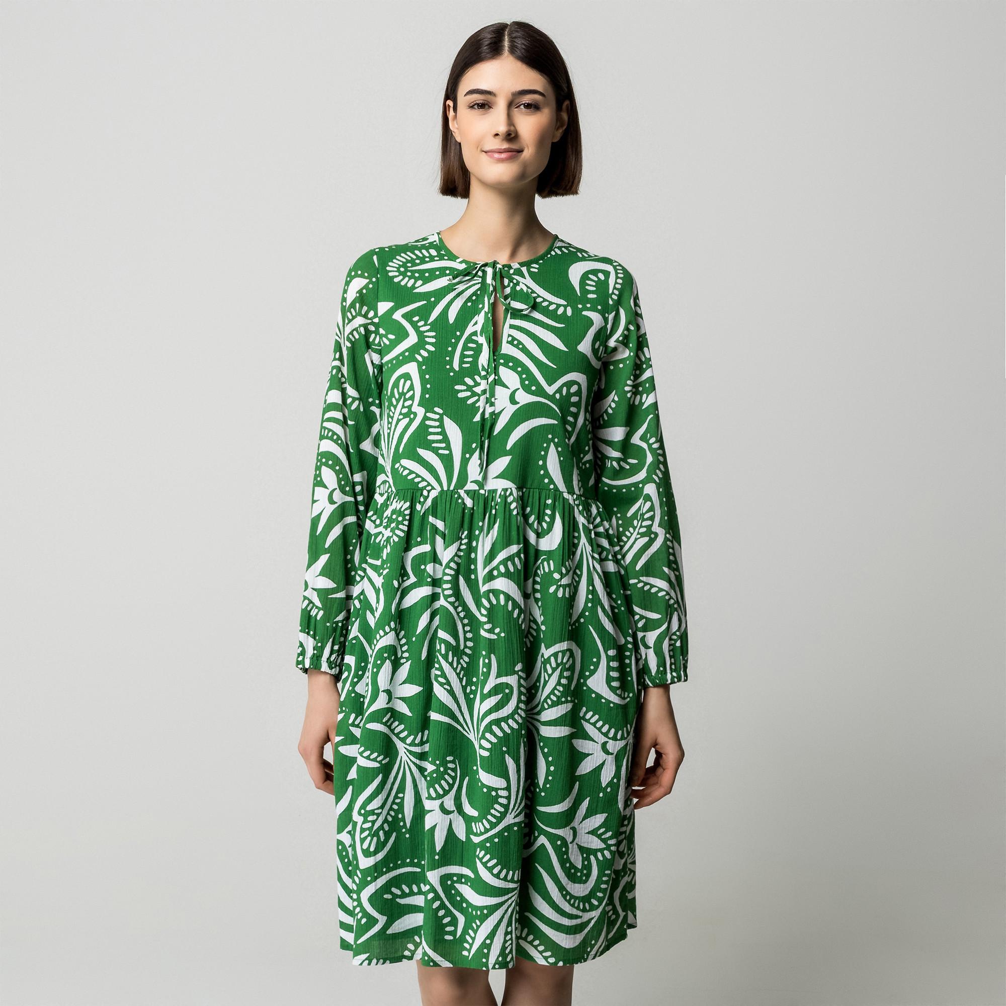 Cette robe de loisirs présente un motif vert et blanc éclatant, offrant un look frais et élégant. Le design comprend un col rond avec un détail à nouer, ajoutant une touche d'élégance. Les manches longues et la coupe décontractée assurent confort et polyvalence pour diverses occasions.
