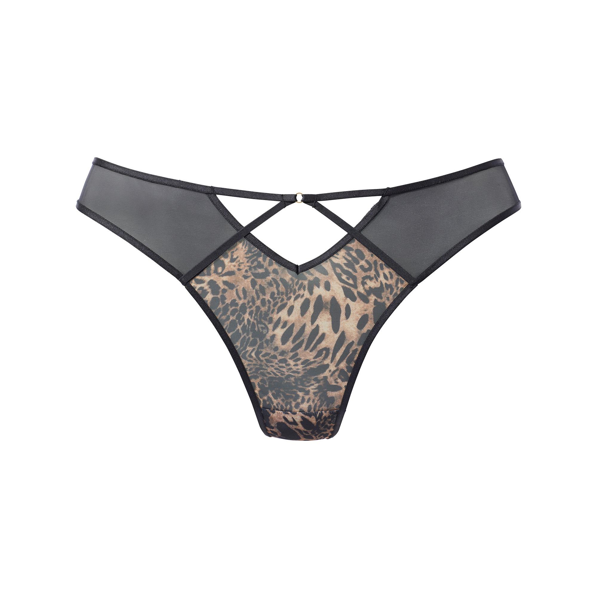Le string séduit par sa découpe sensuelle et son anneau décoratif au centre. Le mesh léopard légèrement transparent offre une allure audacieuse, tandis que le gousset en coton assure un confort optimal. Il est idéal avec les soutiens-gorge assortis de la collection.