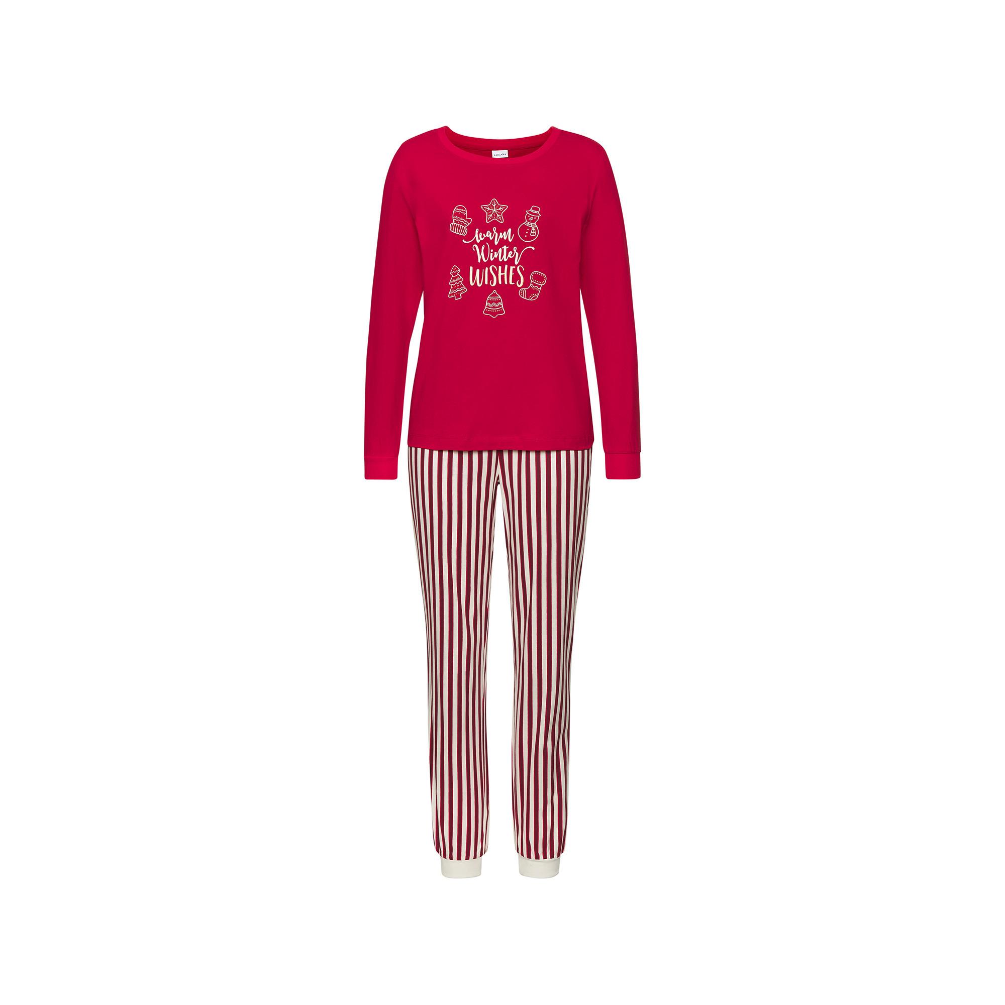 Ce pyjama long apporte une touche festive à la tenue de nuit grâce à son imprimé frontal charmant et son motif intégral. Le haut à manches longues avec col rond et le pantalon à taille élastique offrent une coupe confortable. La qualité en pur coton assure une sensation agréable, idéale pour les soirées d'hiver détendues.