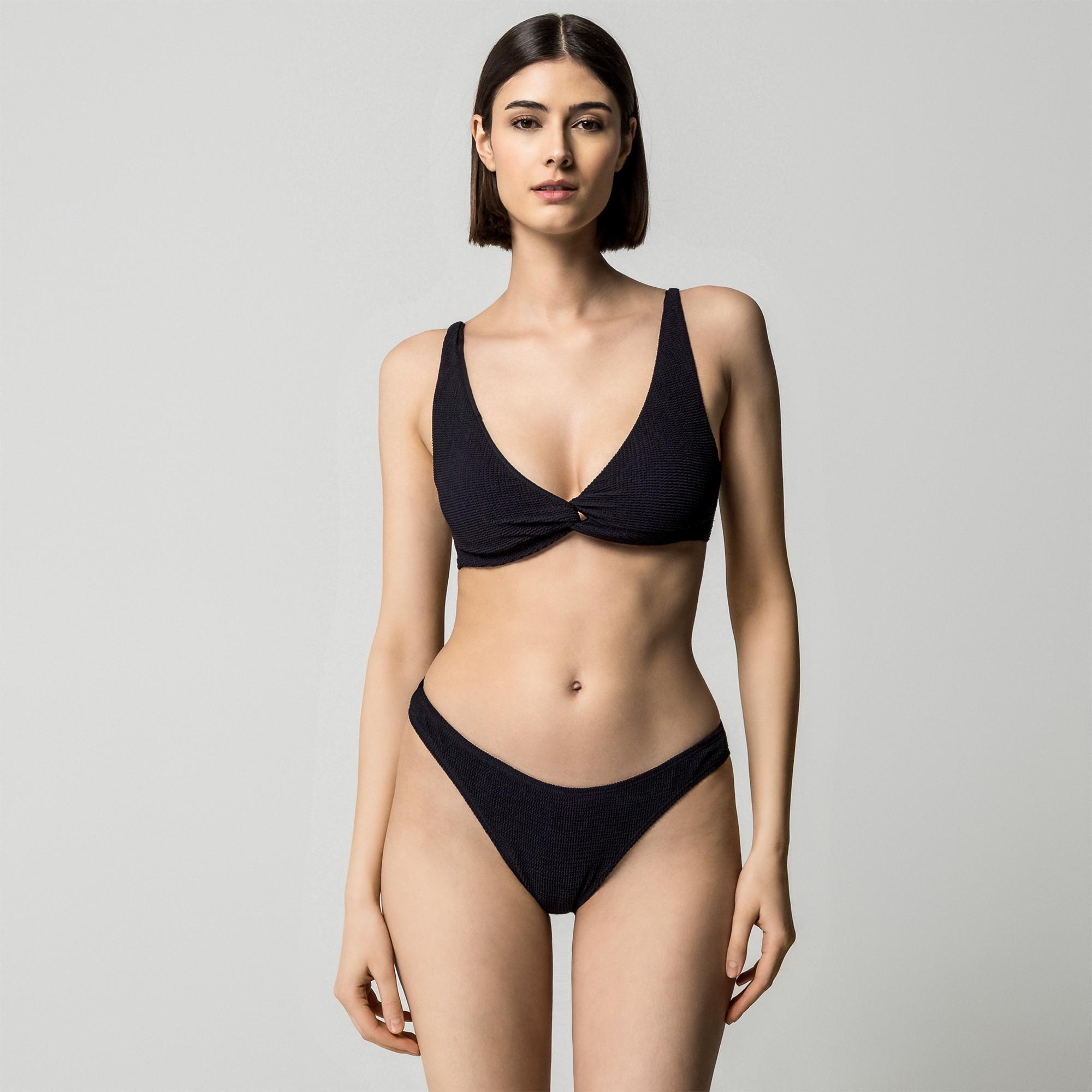 Ce haut de bikini présente un design élégant avec un tissu texturé, offrant une coupe moderne et confortable. Le haut comprend des bretelles réglables et une fermeture à clip dans le dos pour un ajustement sûr et personnalisable.