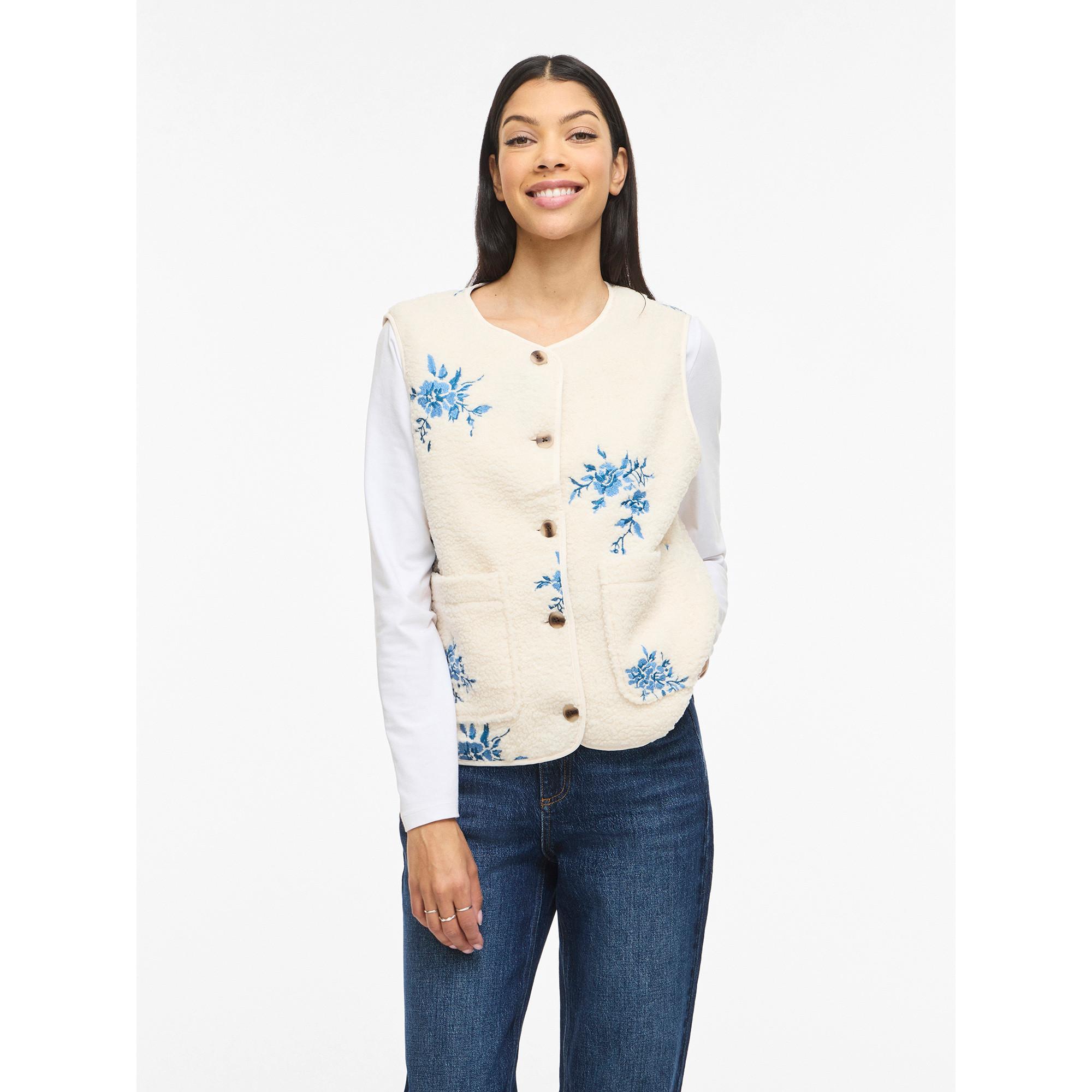 Ce gilet en polaire présente une charmante broderie florale, ajoutant une touche d'élégance à un design douillet. Le gilet est conçu avec un col rond et une fermeture boutonnée sur le devant, ce qui en fait une pièce polyvalente à superposer pour diverses tenues.
