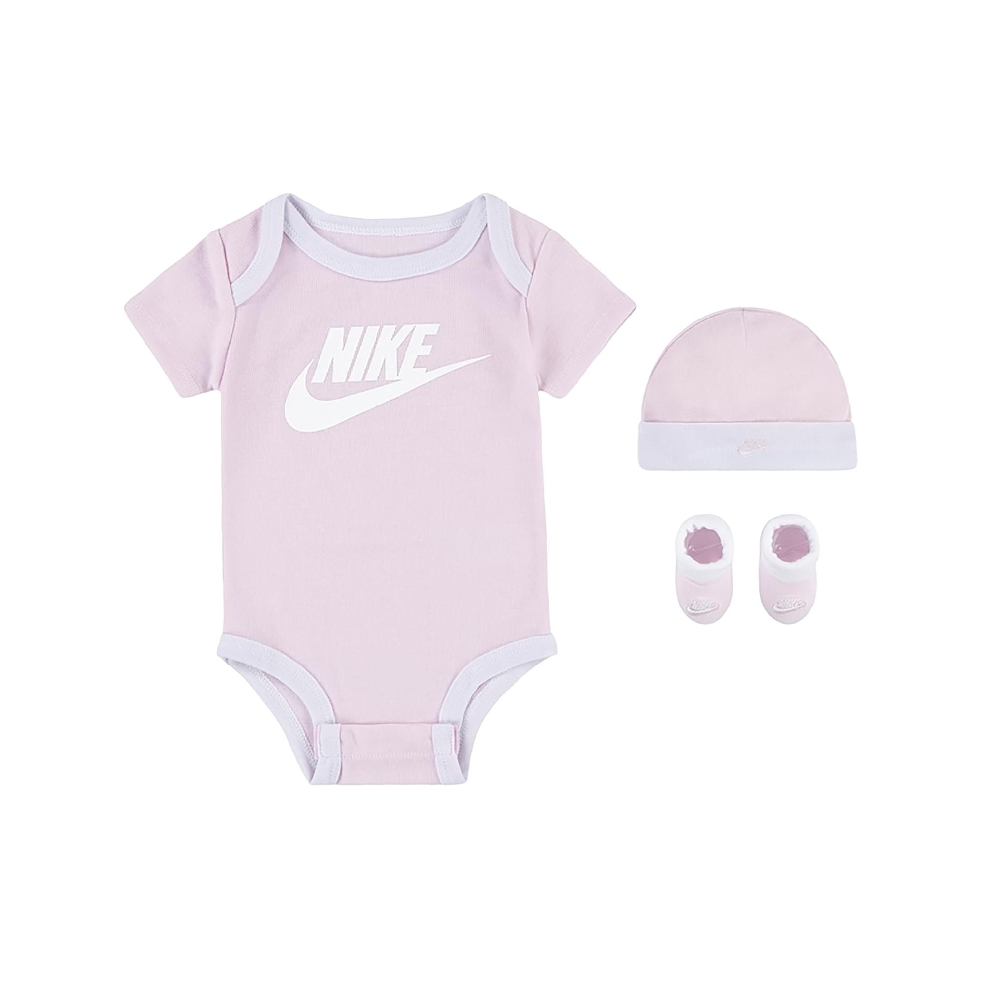 L'ensemble se compose d'un body en coton à manches courtes, d'une casquette et d'une paire de chaussettes qui s'adaptent parfaitement aux petits pieds et ne pincent nulle part. Le logo Nike est imprimé sur le devant du corps et brodé sur la casquette et les chaussures.