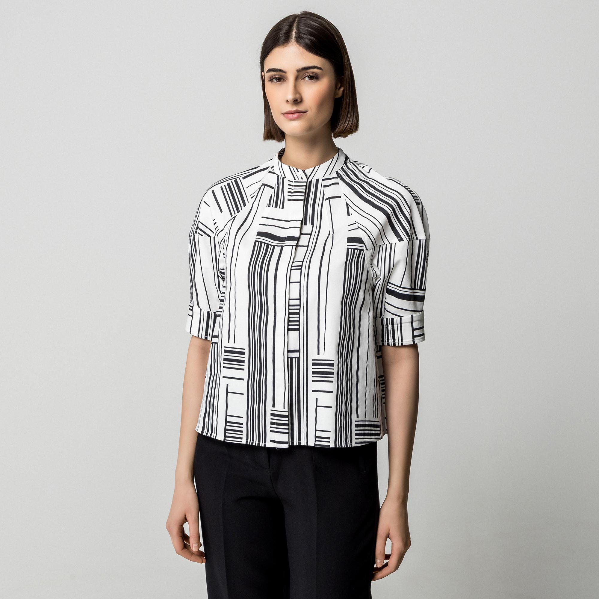 Ce chemisier présente un motif rayé abstrait saisissant en noir et blanc, offrant une esthétique moderne et artistique. Le design comprend un col montant et des manches courtes, créant une silhouette contemporaine adaptée à diverses occasions.